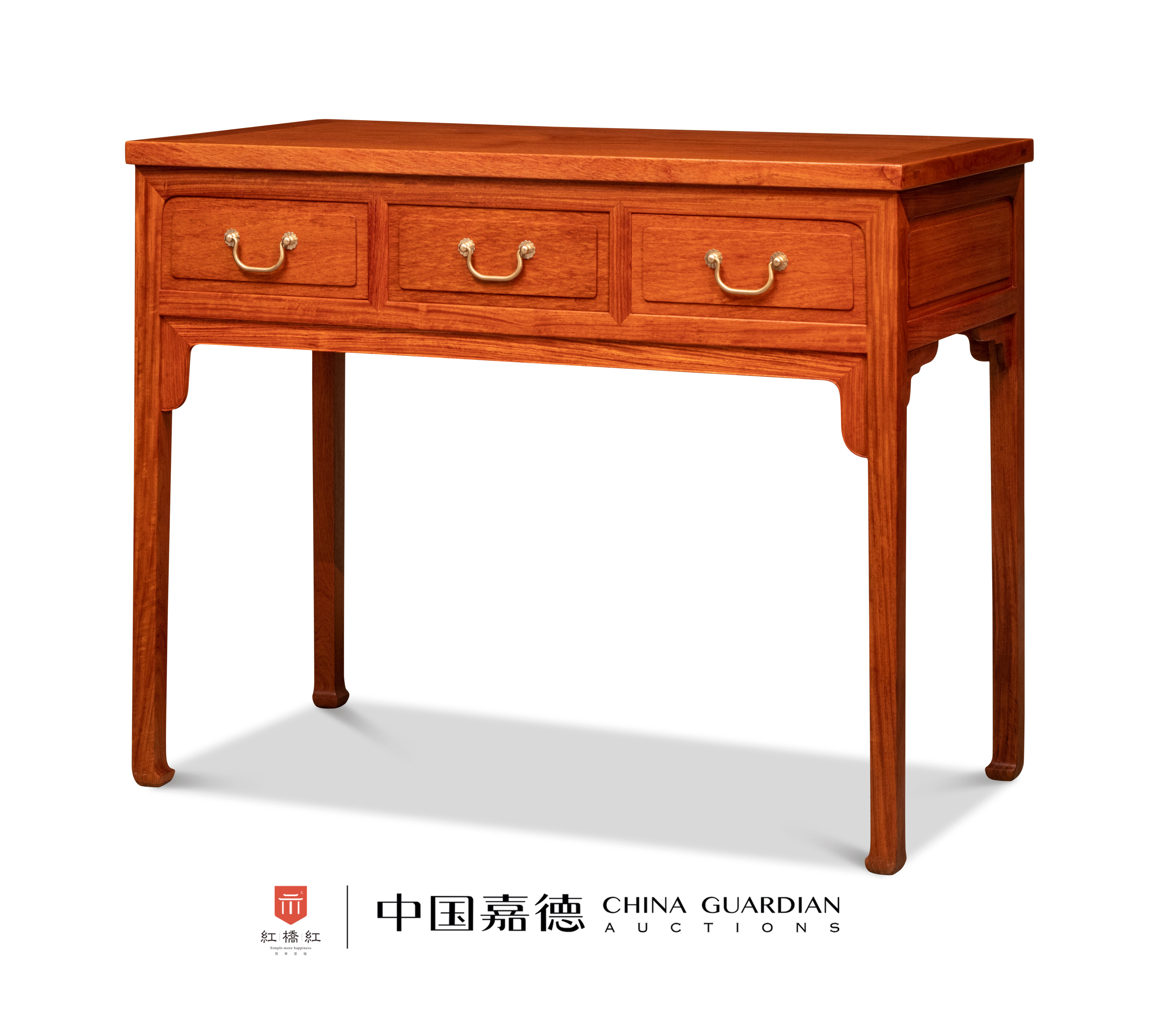 书桌无束腰,三屉,方材,马蹄足,式样简洁。缅甸花梨木制,色泽温润,木纹美观,或顺直,或自然。桌面以格角榫攒框平镶独板面心,边抹平直。无束腰,面下安抽屉架和三具抽屉,抽屉脸落堂起鼓做,侧面亦然,可见细节考究。抽屉脸上安弧形拉环,使用便利,金黄的铜件与红润的木质形成对比。抽屉架下又安光素的刀牙板加固,结构严谨。四足方材,内收扁马蹄。置于书房,收纳趁手,简洁美好。