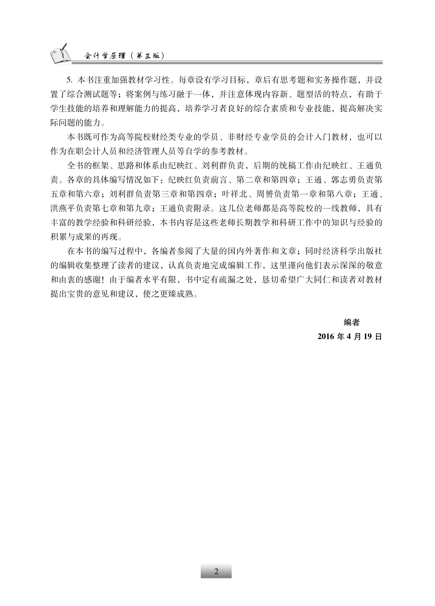 同时,本教材结合会计学原理的基本知识、方法和技术,积极融入新时代中国特色社会主义思想以及党的二十大精神,根据《普通高等学校教材管理办法》《高等学校课程思政建设指导纲要》的思想,设计基础会计知识和思政元素结合的案例,通过案例描述和案例思考题的方式,自然的体现在对应章节的思政案例分析题中,更好地服务于立德树人的目标。