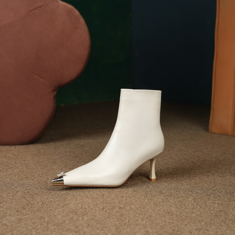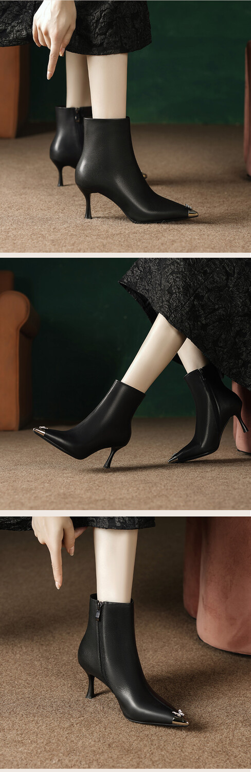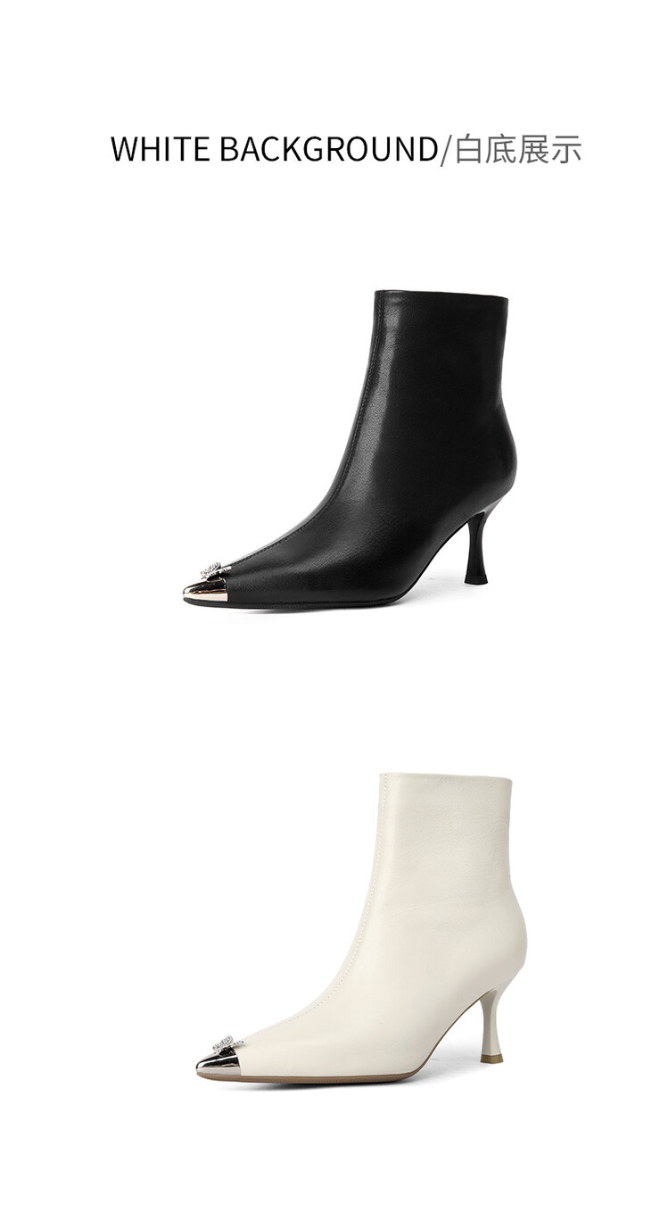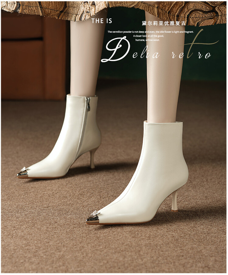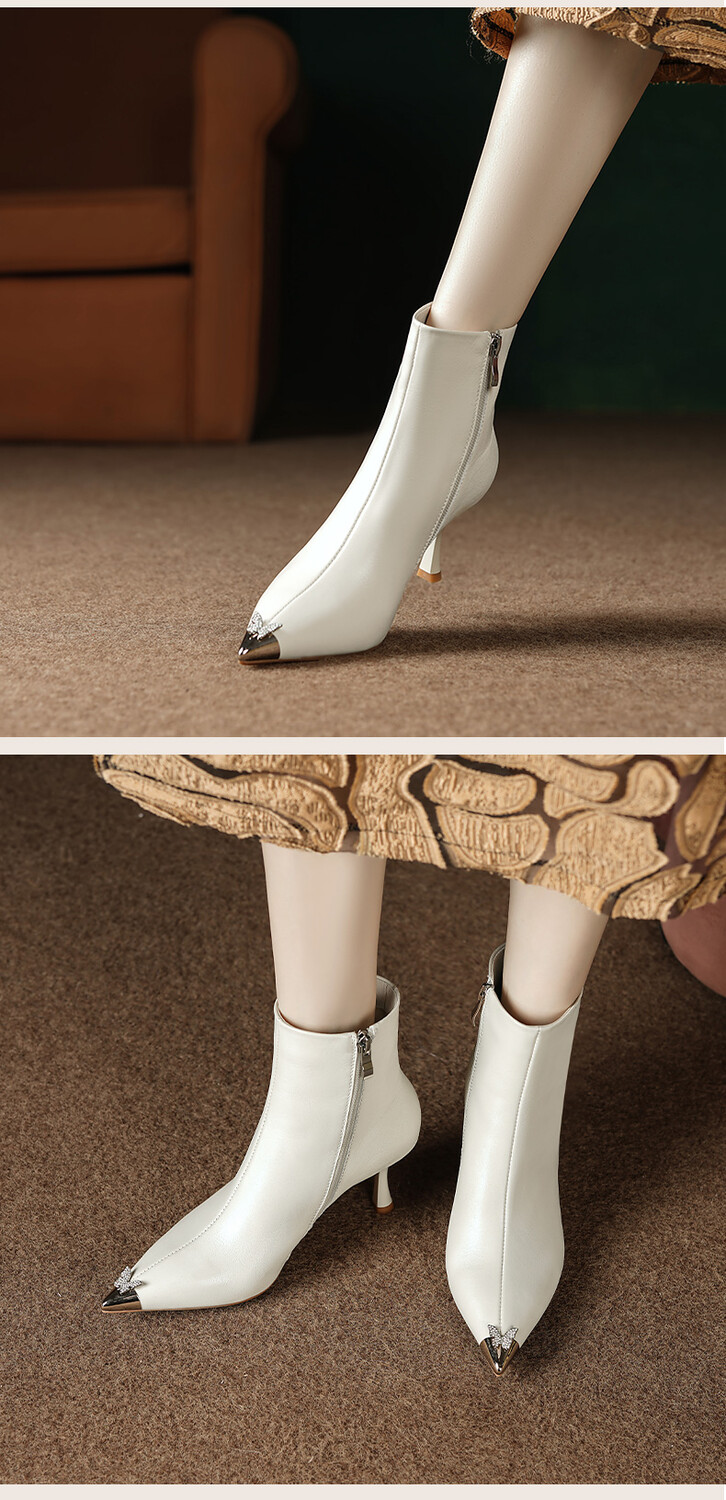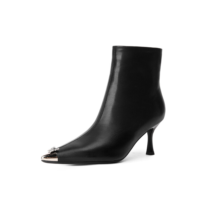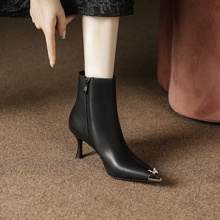 【预售5天】柔软舒适头层水染牛皮尖头短靴女细跟名媛蝴蝶钻金属头高跟时装靴DS&1299