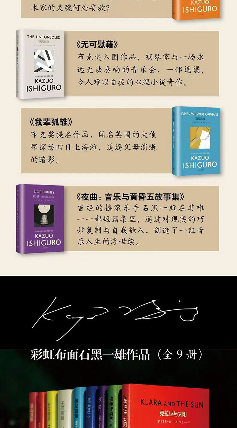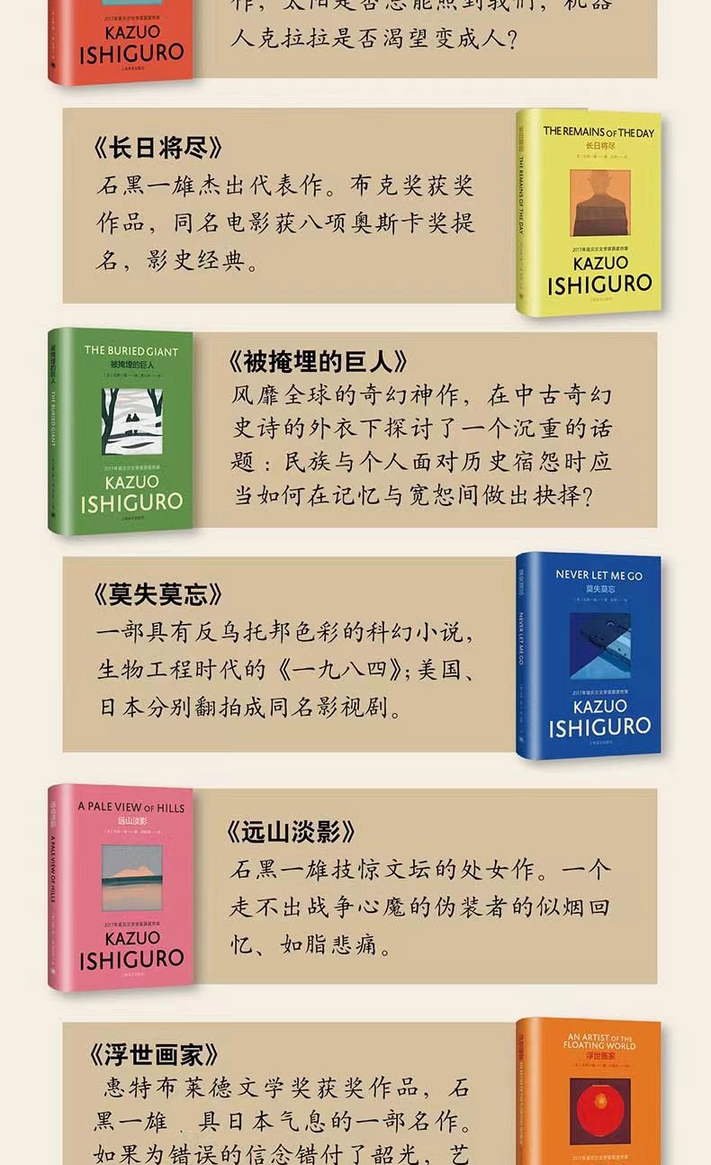 《长日将尽》是诺奖得主石黑一雄1989年获布克奖的作品,也是石黑一雄最重要的代表作。小说以管家史蒂文斯的回忆展开,讲述了自己为达林顿勋爵服务的三十余年时光里的种种经历;虽然达到了职业巅峰,但史蒂文斯过于冷酷地压抑自我情感,追求完美履行职责,在父亲临终前错过最后一面,之后又与爱情擦肩而过。小说通过主人公的回忆,将一个人的生命旅程在读者眼前抽丝剥茧,同时也折射出一战与二战之间那段非常时期的国际政治格局。1993年根据小说翻拍的同名电影(又名《告别有情天》)由英国有名演员安东尼·霍普金斯和艾玛·汤普森主演,获得八项奥斯卡奖提名和六项英国电影学院奖提名,成为影史经典。