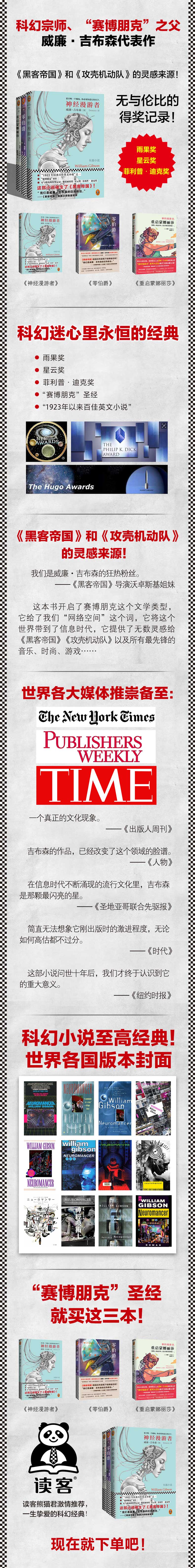 威廉•吉布森不仅为科幻小说开辟了一个全新的疆域,他天才的文风和犀利的哲学思辨,更赋予科幻小说一种新的质感与厚度。他的每本小说,均是可以被反复品味、反复重读的当代经典。