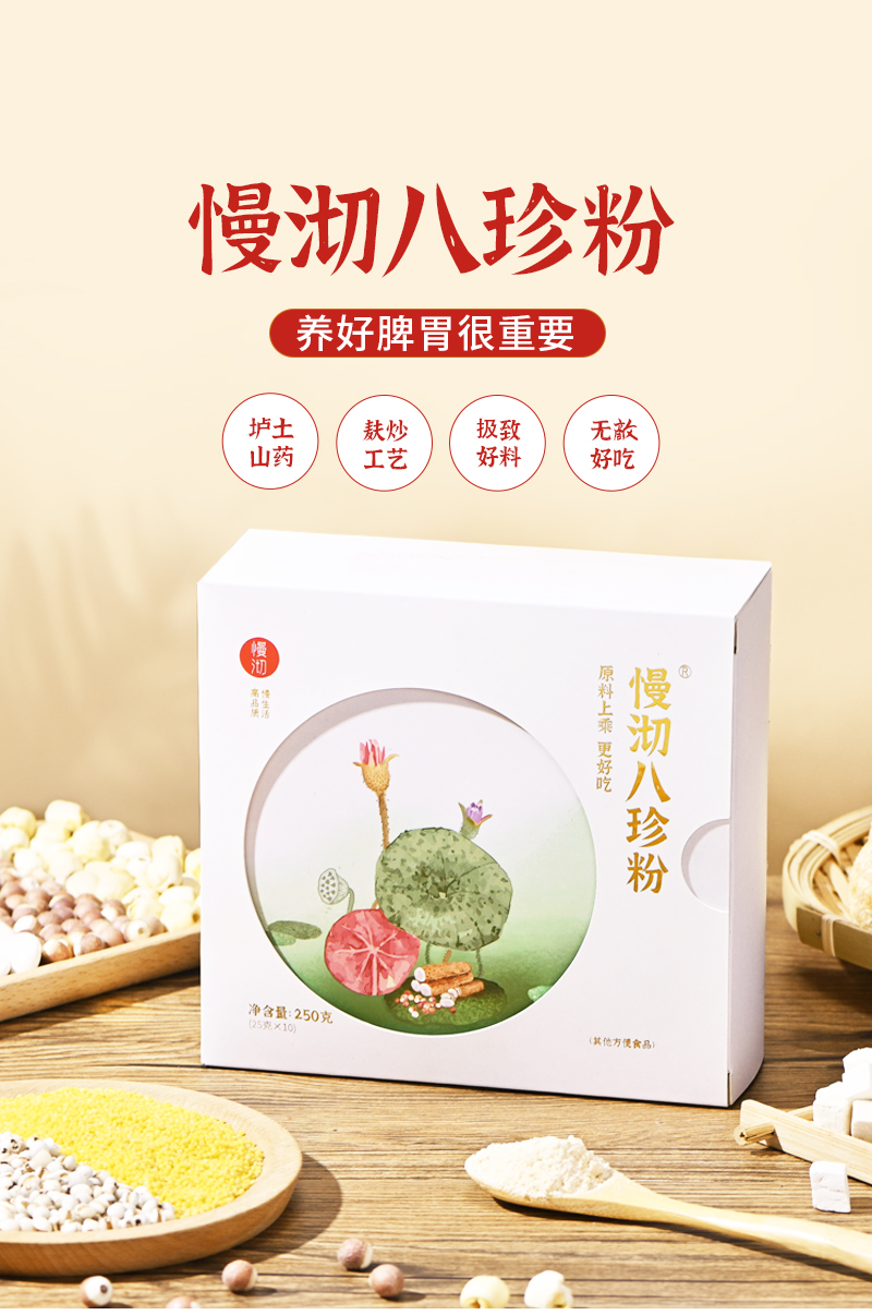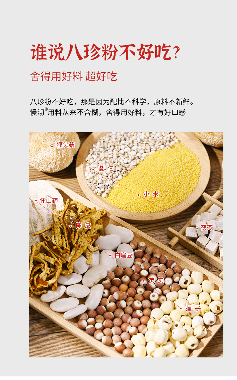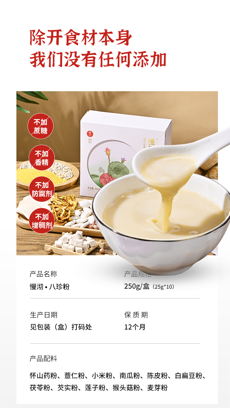 【配 料】: 怀山药粉,薏仁粉,小米粉,南瓜粉,陈皮粉,白扁豆粉,茯苓粉,芡实粉,莲子粉,猴头菇粉,麦芽粉