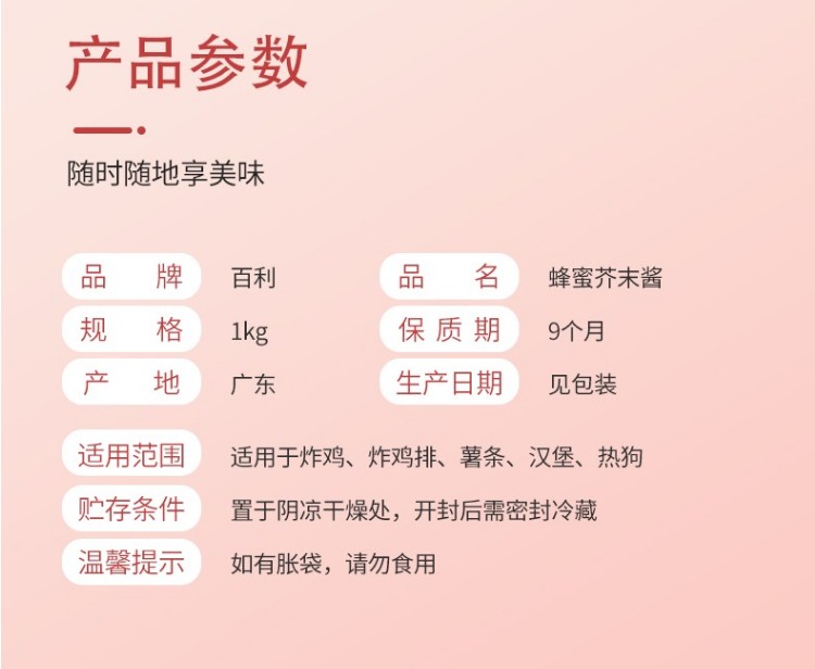 1kg 百利 韩式蜂蜜芥末酱 炸鸡酱汉堡热狗色拉酱韩国料理沙拉酱