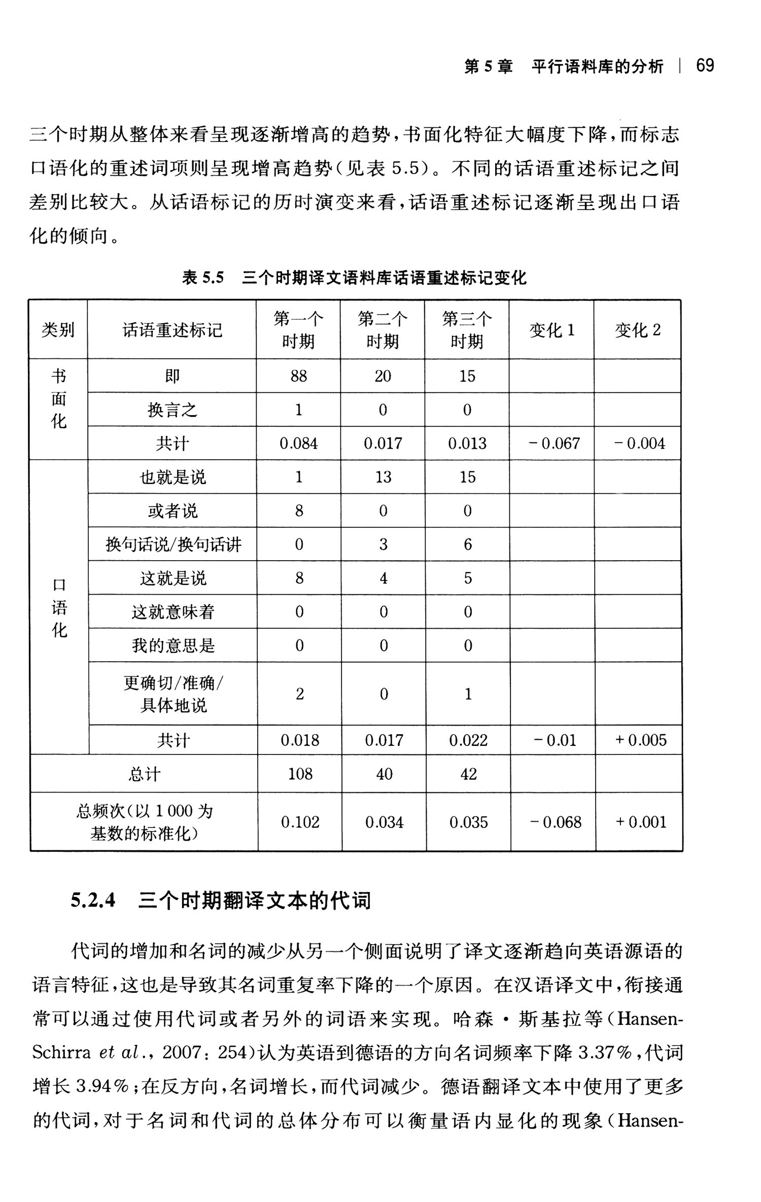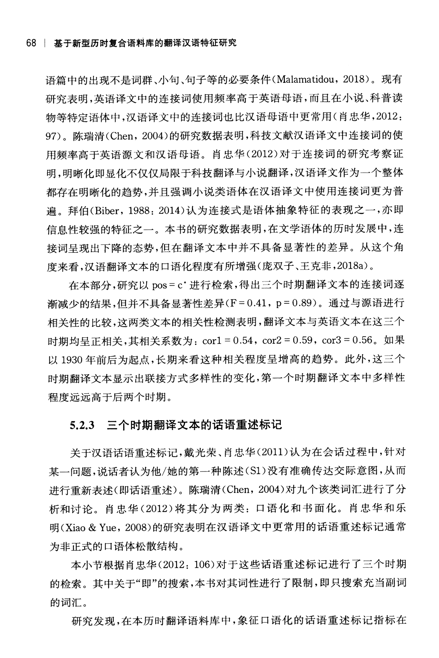 《基于新型历时复合语料库的翻译汉语特征研究》通过构建新型语料库,运用多元统计的方法分别考察了20世纪30年代、60年代、90年代三个时间段的文学翻译文本在语体、词汇和语法上的语言表征,并对英语源语文本、汉语翻译文本、汉语原创文本以及未受翻译影响的汉语原生态文本之间的相互关系和变化进行了系统的、连续的考察,进一步探究了翻译与原刨汉语语言发展间的关系。