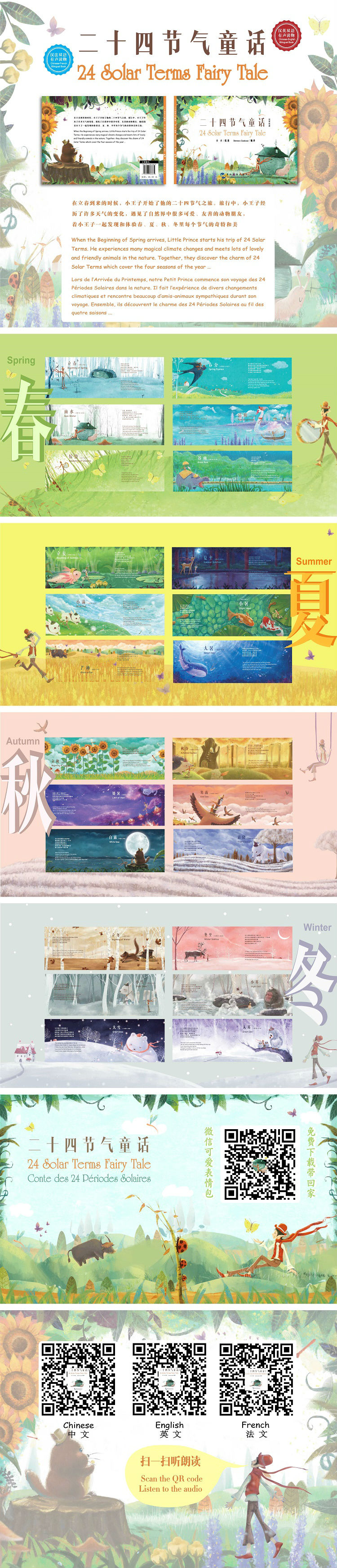 "在立春到来的时候,童话故事的主人公(插画中的小王子)开始了他的24节气之旅。在旅行中,“小王子”经历了许多天气的变化,遇见了自然界中很多的奇特,可爱,友善的动物朋友们,它们陪着“小王子”一起发现,体验 春/夏/秋/冬 每个节气的奇特和美妙之处“。这个故事情节充满了童趣和想象,文字部分浅显易懂,从主人公的视角自然地解读了每个节气的特点,和插画部分交相呼应,更加体现了中国24节气的优美。整个24节气的插画内容的创作特点也具有西方童话故事的风格,但讲述的确是中国的传统文化,符合了中西方的审美观念,应该可以受到中国和西方世界的小朋友们甚至成人的喜欢。绘本24张插画连起来是一个童话故事,每张插画的文字部分,是通过主人公(小王子)的视角来对插画内容和节气进行描述。绘本特别邀请“晓华亲子英语”公众号平台的人气小主播Emma小朋友进行英文配音,法国插画师美珊女士进行法文配音,让你感受纯正的美式英语和地道的法语。只需轻松扫一扫即可收听。本绘本深受法国时尚设计师、插画师美珊 ( Ms. Bérénice Zandonai )的喜爱,并由她着力推荐出版,书中英文、法文皆系她翻译。她说:“让全世界的人们可以通过阅读这本充满童趣又融合中西画风的绘本, 感受到中国优秀的传统文化。”
