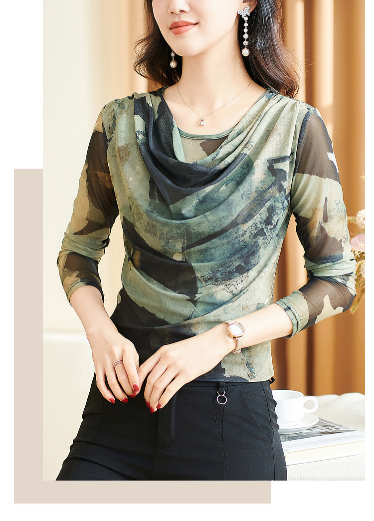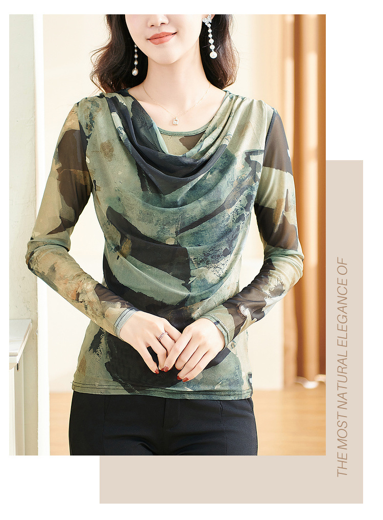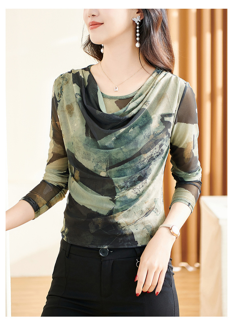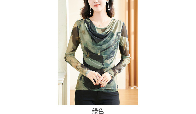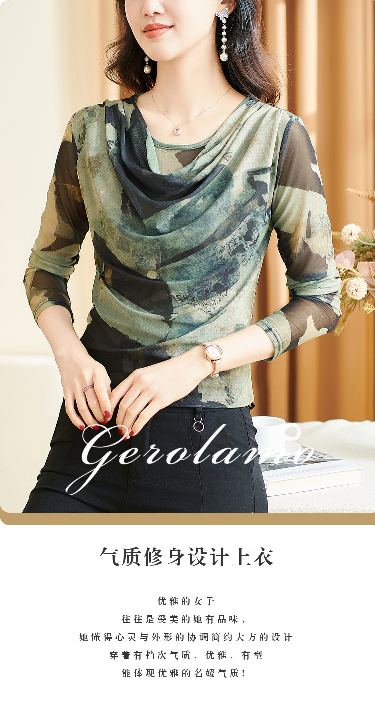 秋网纱印花圆领时尚打底衫,堆堆领修身显瘦长袖T恤KQL-E001M6853