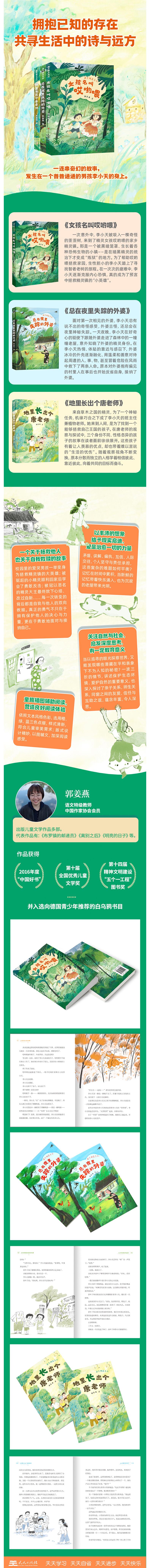 1.名作家新作:郭姜燕是一位成熟的儿童文学作家,也是一位优秀的特级教师,具有较强的谋篇布局、写景状物的能力。对生活的观察准确而细腻,语言生动而简劲,常给小读者们带来启发。 2.童趣插图辅助阅读,营造良好阅读体验:童话风格插画,清新色彩点缀,符合儿童审美需求;版式设计精妙,以图辅文,加深阅读感受。 3.现实底色+奇幻色彩,以丰沛的想象给予现实启迪:精灵的神秘力量、乡村的原始氛围为故事添了一层飘渺的色彩,但主线情节的日常感又拉进了现实共鸣。矛盾、误解、偏执、责任、互信。人际交往、个人坚守与责任承担,这些复杂的难题如何平衡,或许书中给了我们一些启迪。 4.蕴含哲理,启发深度思考,爱是治愈一切的力量:外婆为何要守护老屋的记忆,“老屋的记忆”在现实意义中又有着怎样丰厚的隐喻?记忆在时间中累积,当新鲜的记忆带着快乐涌入,也为沉寂的老屋带来光明。