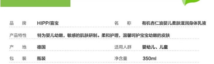 【保税仓】德国 喜宝(Hipp)有机杏仁油婴儿润肤露润肤乳 350ml