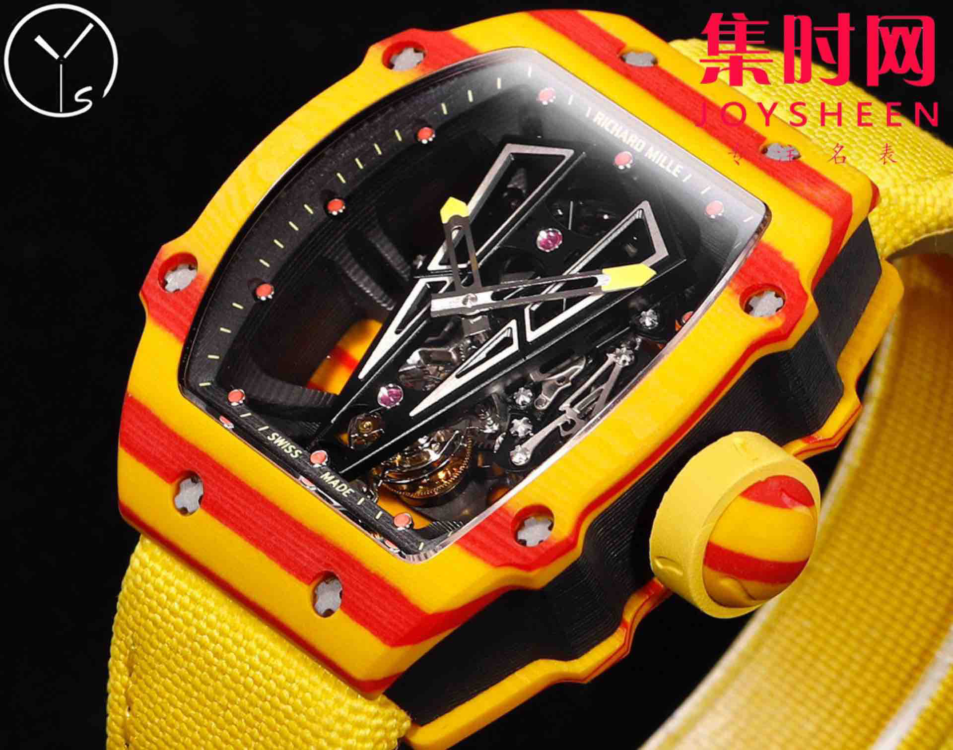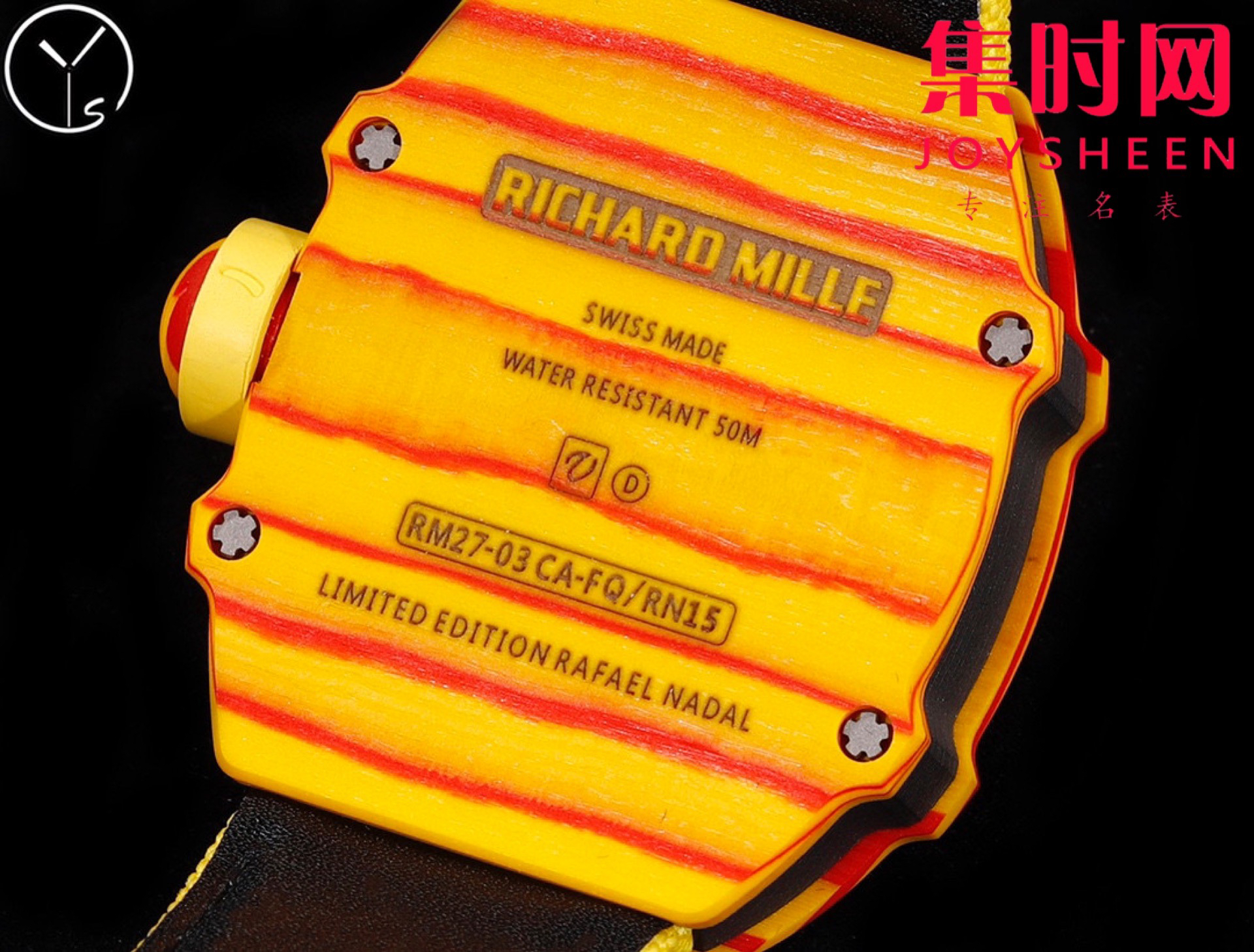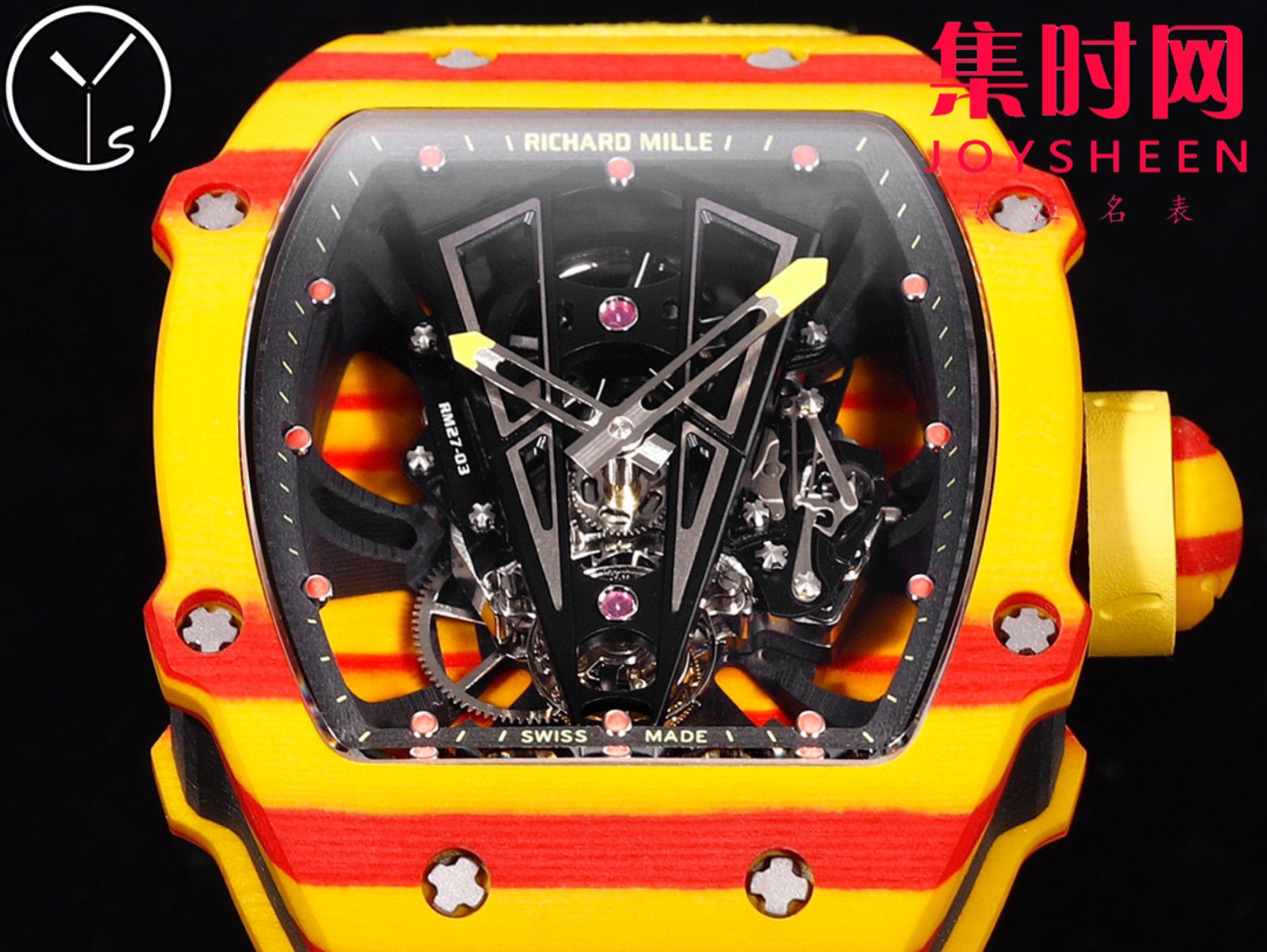 YS理查德米勒 里查德米尔红土RM27−03 陀飞轮腕表 咆哮的公牛 整表表壳采用TPT石英纤维 理查德 五级钛合金螺丝超轻体验 表壳尺寸:47.70×40.50毫米 表壳厚度:15.5毫米 RM27−03改进了表壳机芯一体化结构,机芯表壳融为一体,没有了传统的机芯主夹板概念 ,TPT石英碳纤维表壳由二氧化硅分离得到多层平行细丝构成,后插入TPT碳纤维层形成表壳上的特殊纹理,每个腕表都有他独特的纹理条纹!