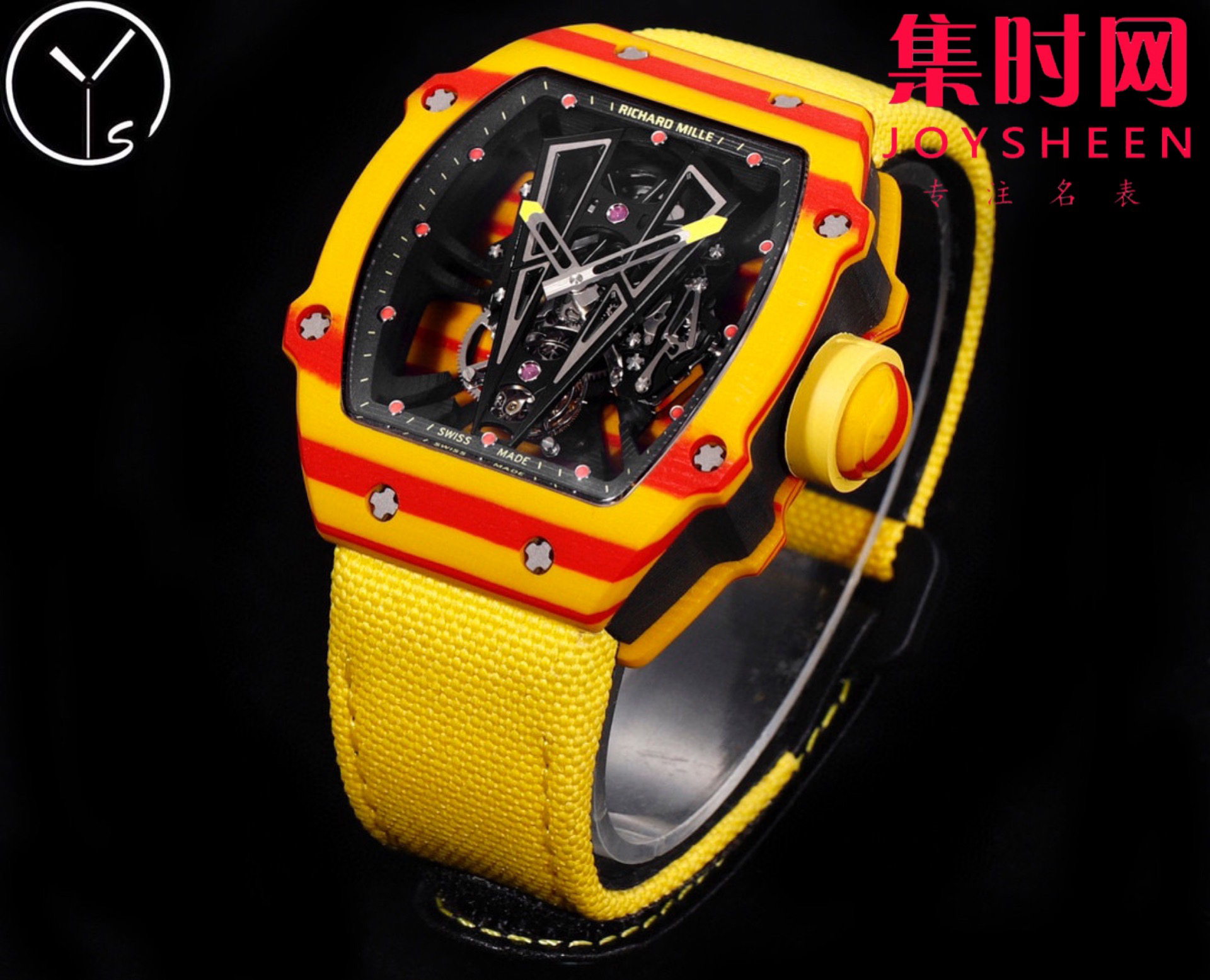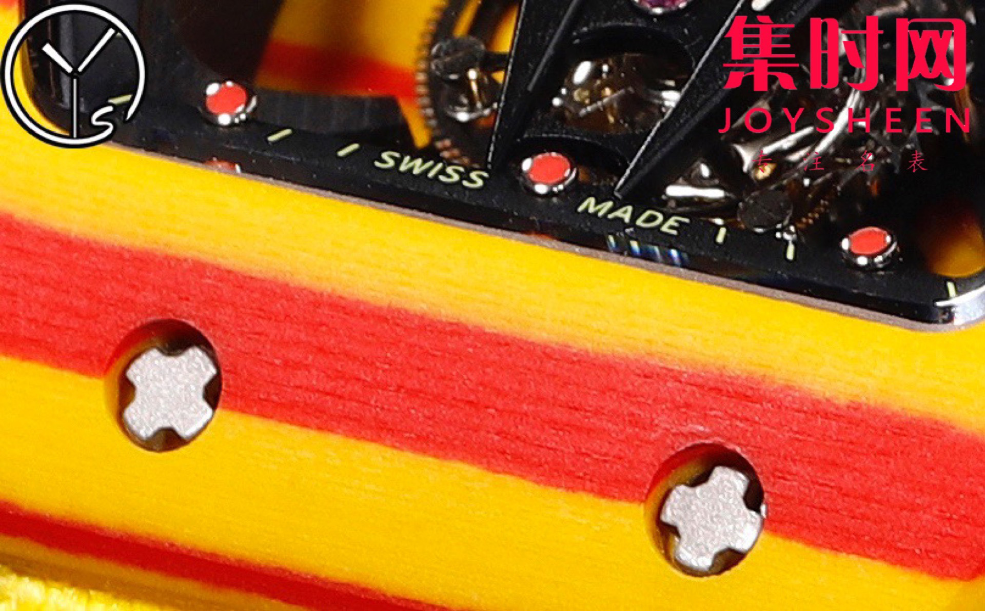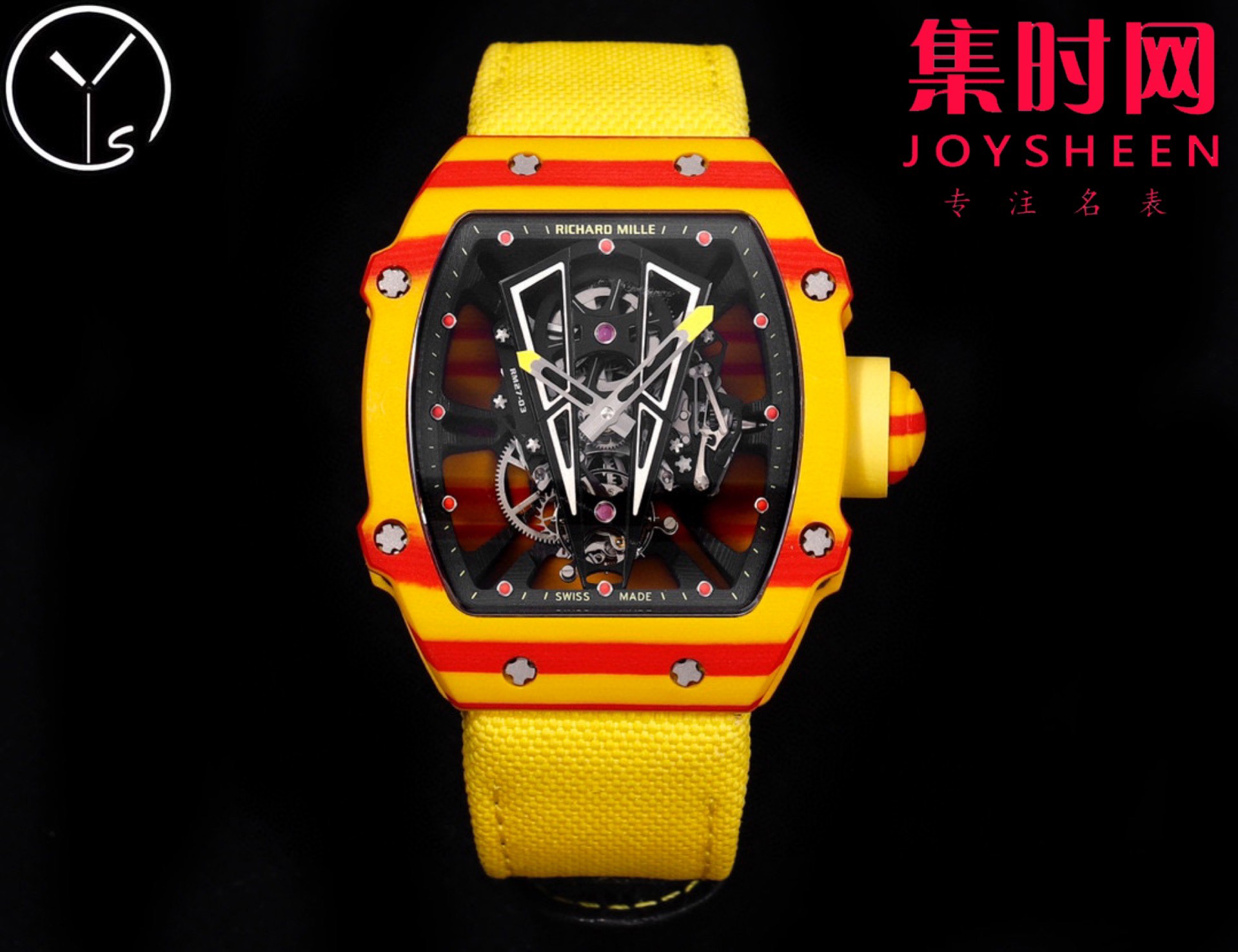 YS理查德米勒 里查德米尔红土RM27−03 陀飞轮腕表 咆哮的公牛 整表表壳采用TPT石英纤维 理查德 五级钛合金螺丝超轻体验 表壳尺寸:47.70×40.50毫米 表壳厚度:15.5毫米 RM27−03改进了表壳机芯一体化结构,机芯表壳融为一体,没有了传统的机芯主夹板概念 ,TPT石英碳纤维表壳由二氧化硅分离得到多层平行细丝构成,后插入TPT碳纤维层形成表壳上的特殊纹理,每个腕表都有他独特的纹理条纹!