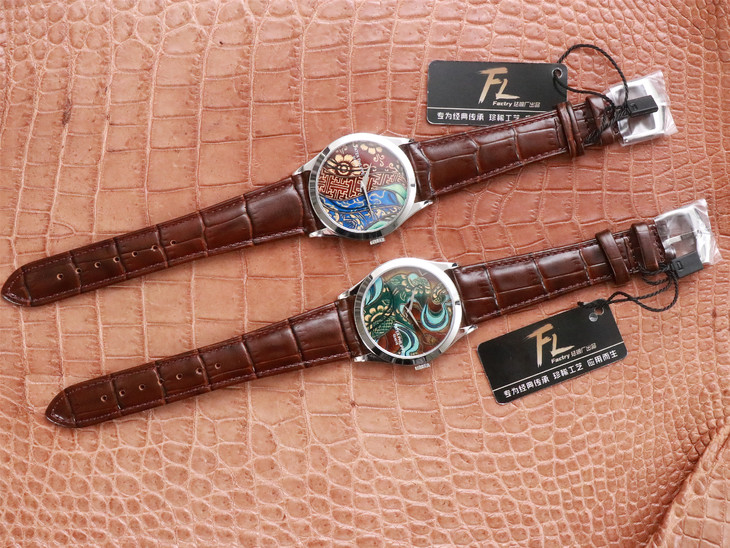 FL百达fei丽5077P-103《不丹八色织品》,真微绘珐琅工艺腕表,表径38.6mm,男士腕表,自动机械机芯,皮表带,透底。