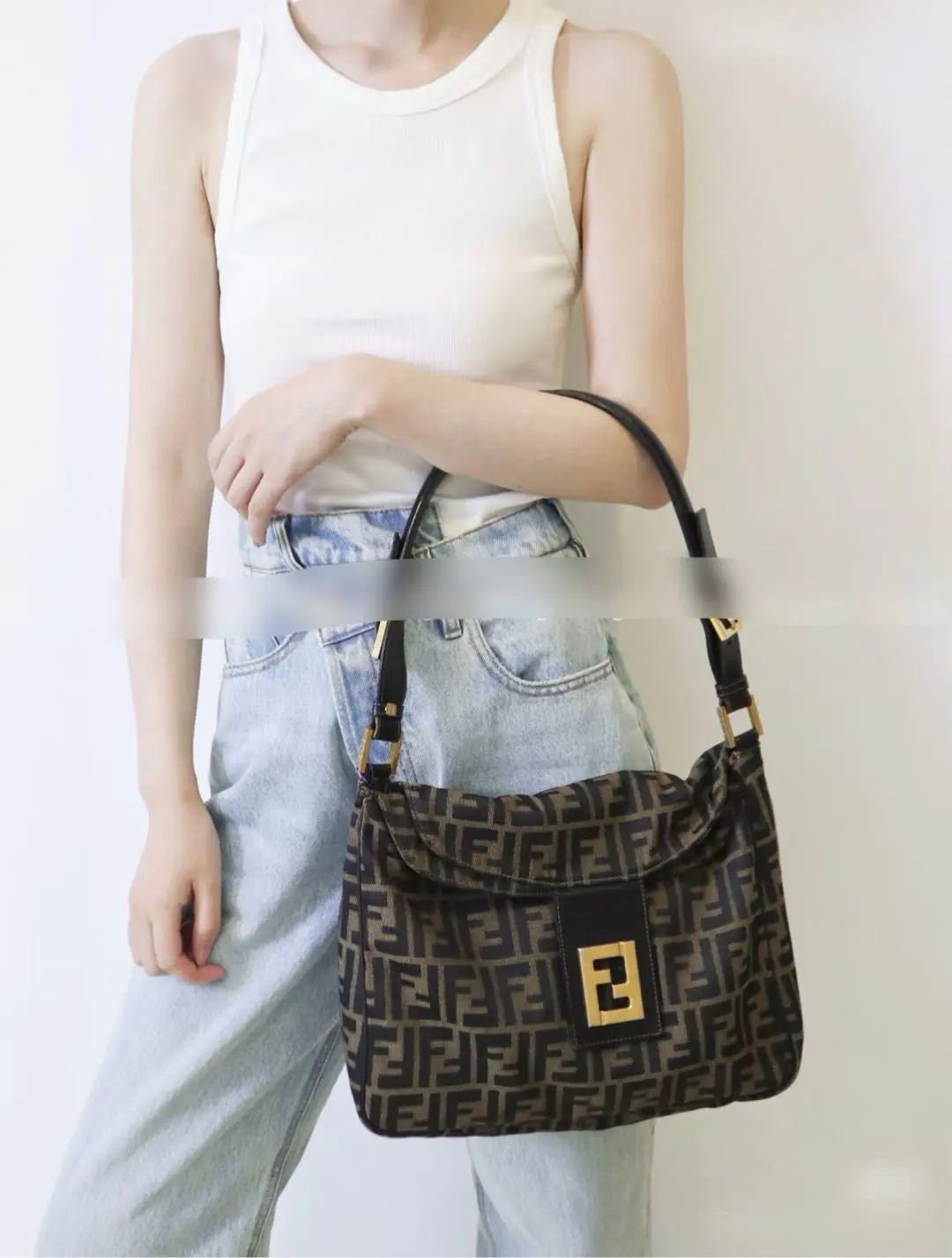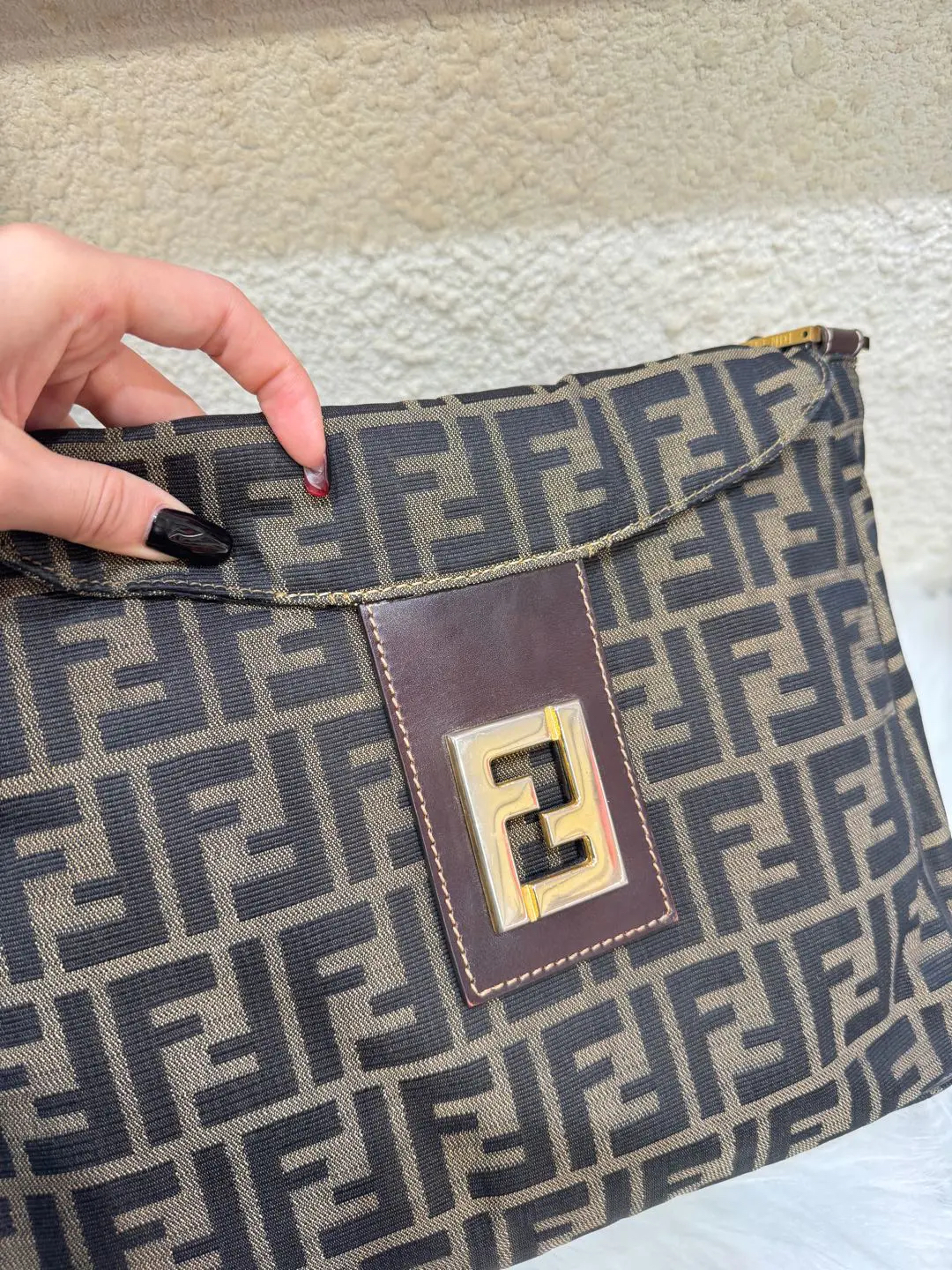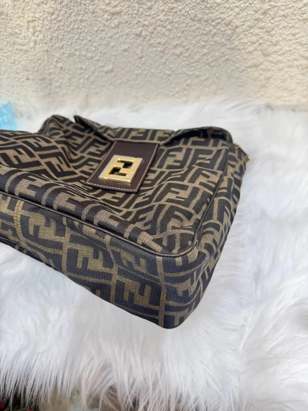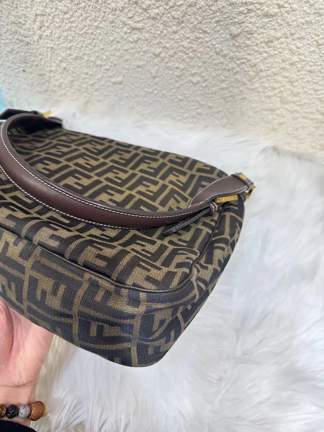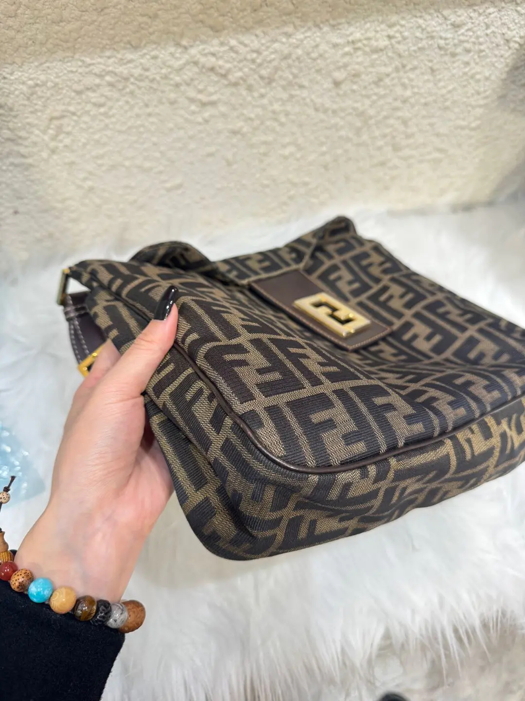 【商品详情】正品二手 FENDI 大号 棕老花 金扣 帆布 大胖丁 单肩包🥥 95新 30×23。金属正常使用感。复古时尚