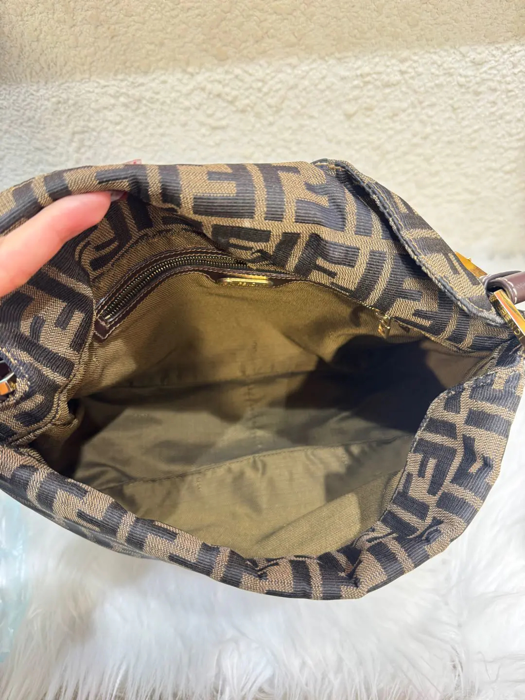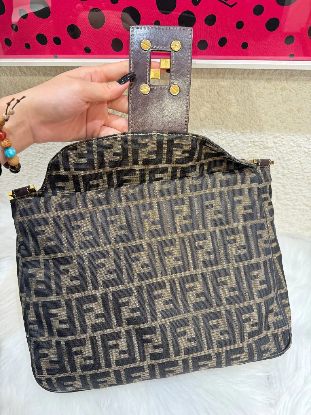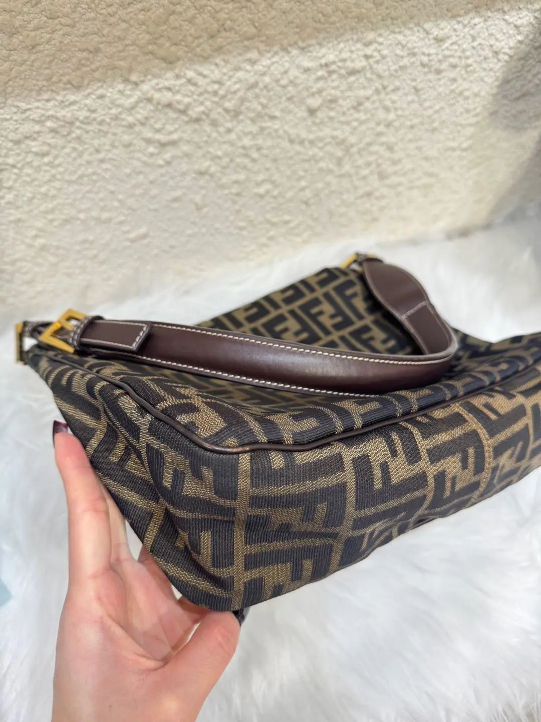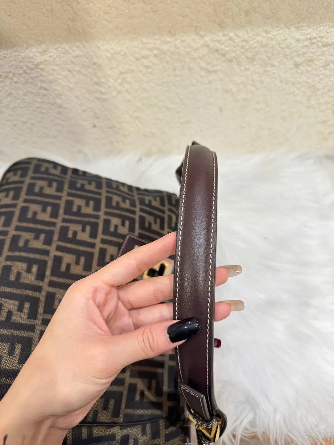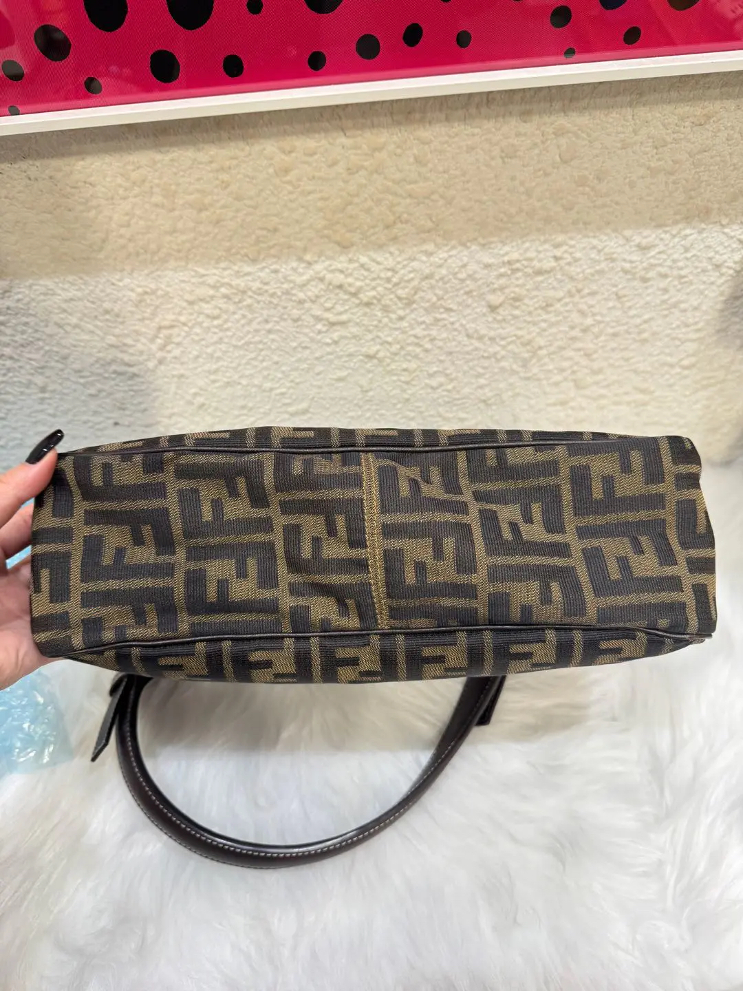 【商品详情】正品二手 FENDI 大号 棕老花 金扣 帆布 大胖丁 单肩包🥥 95新 30×23。金属正常使用感。复古时尚