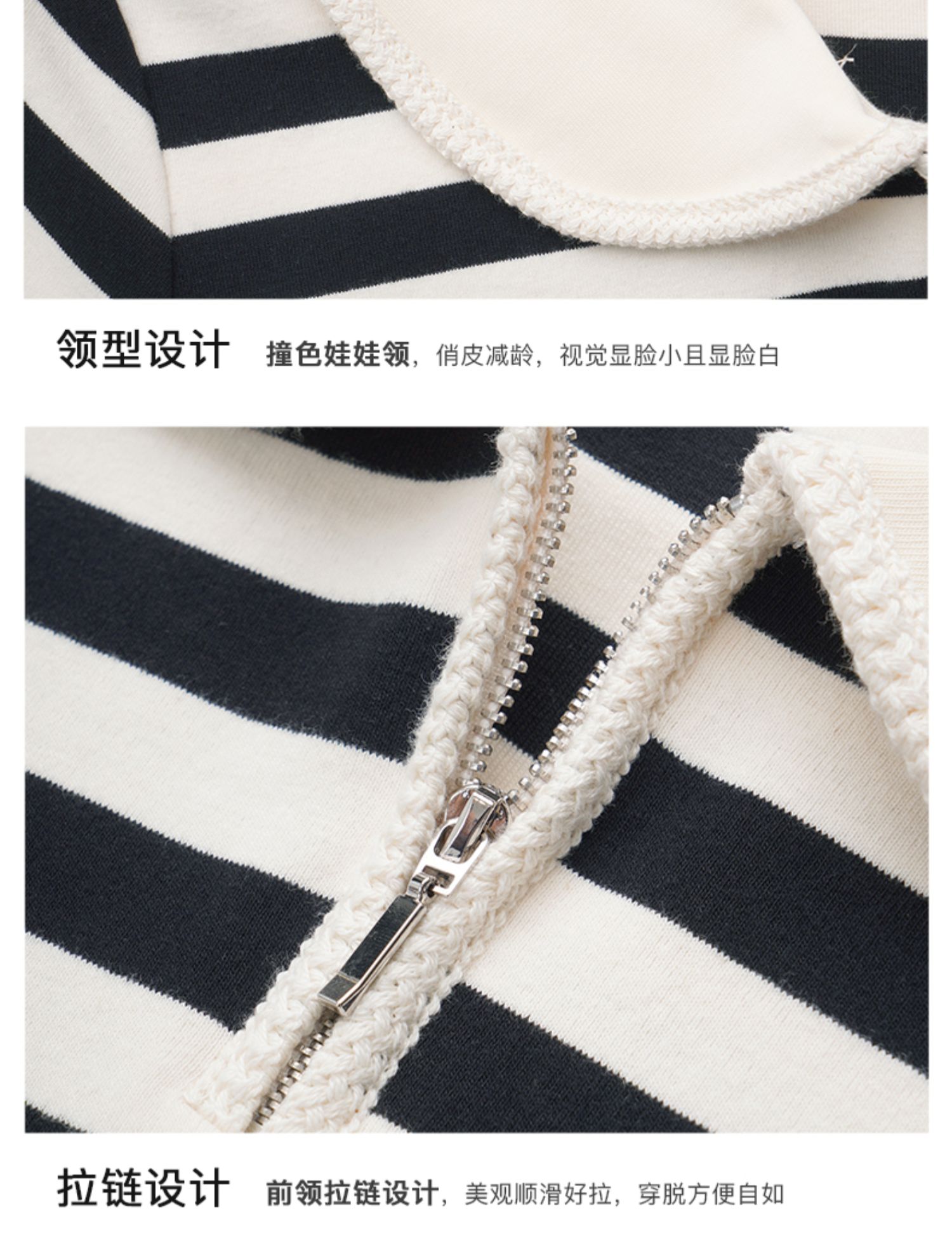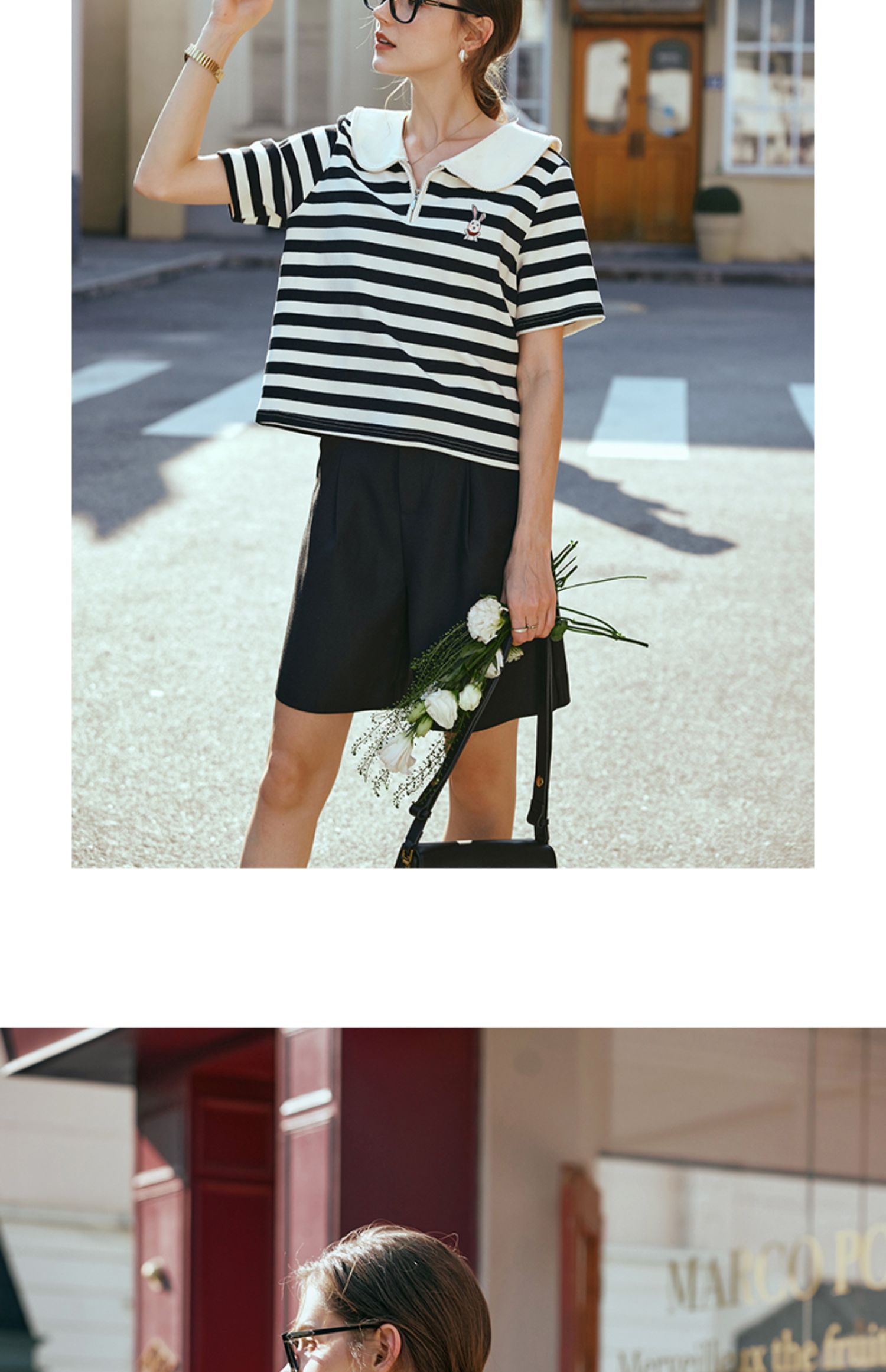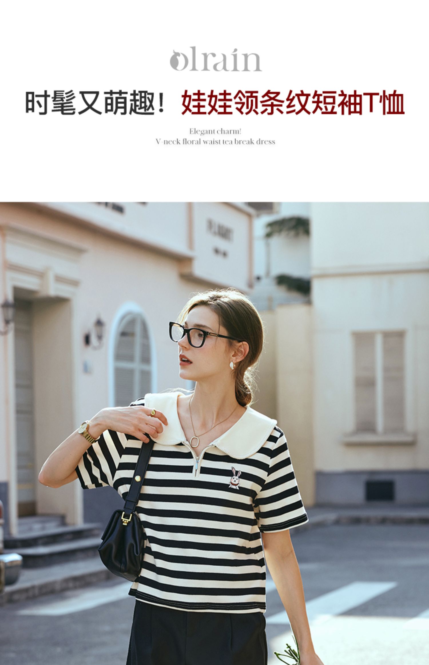 OLrain欧芮儿黑白条纹T恤女早春2024年新款宽松娃娃领短袖上衣