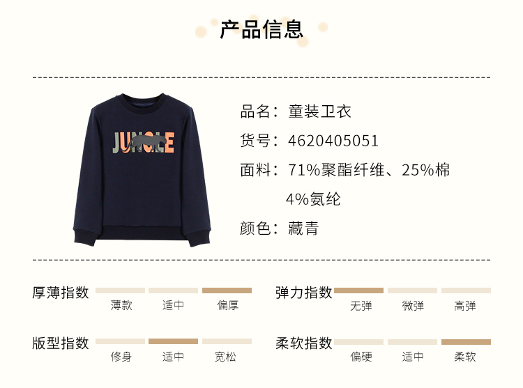 | 材质成分: 聚酯纤维71% 棉25% 聚氨酯弹性纤维(氨纶)4% |