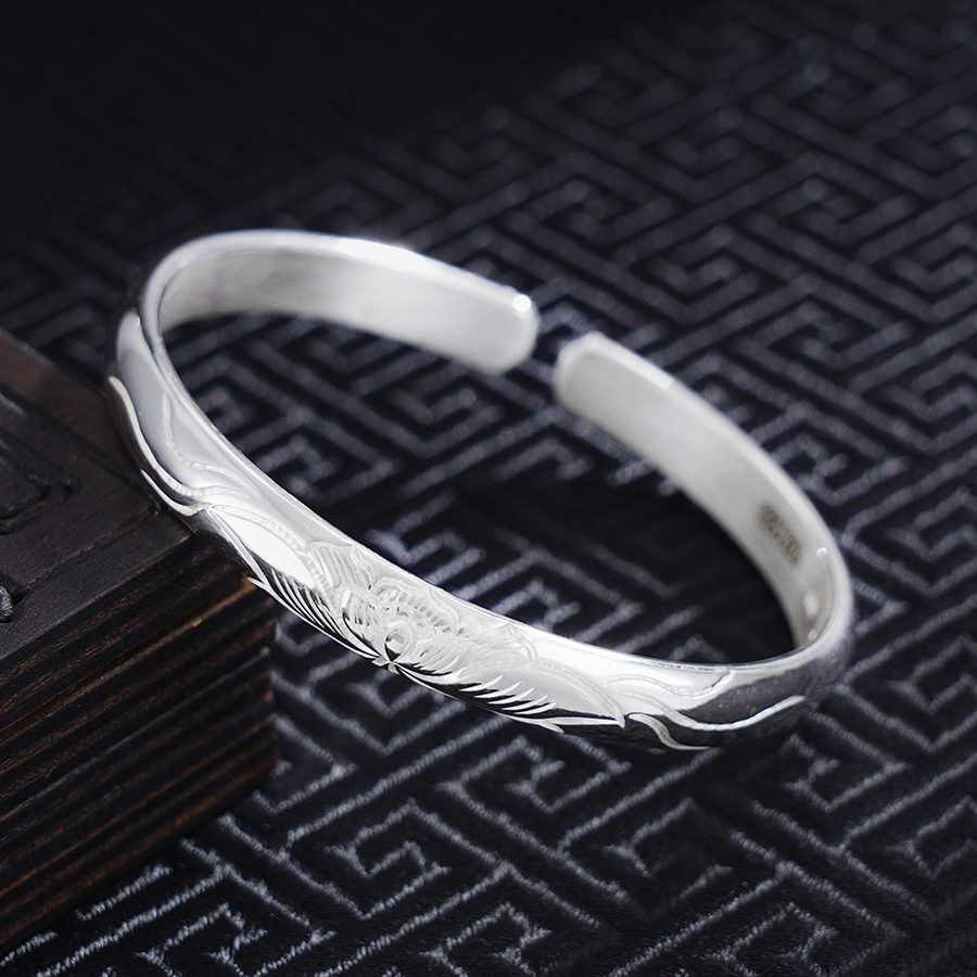 【寓意】:纯银开口手镯,镯面錾刻莲花图案。花瓣纹理细腻,灵动之感扑面而来,寓意纤尘不染,静享美好流年。