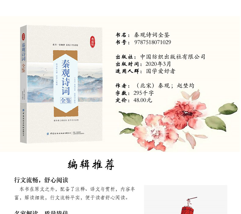 正版新书包邮 秦观诗词全鉴 婉约词派代表人物之一 与张耒、晁补之、黄庭坚并称“苏门四学士” 其词兼具情感与文辞 雅俗共赏