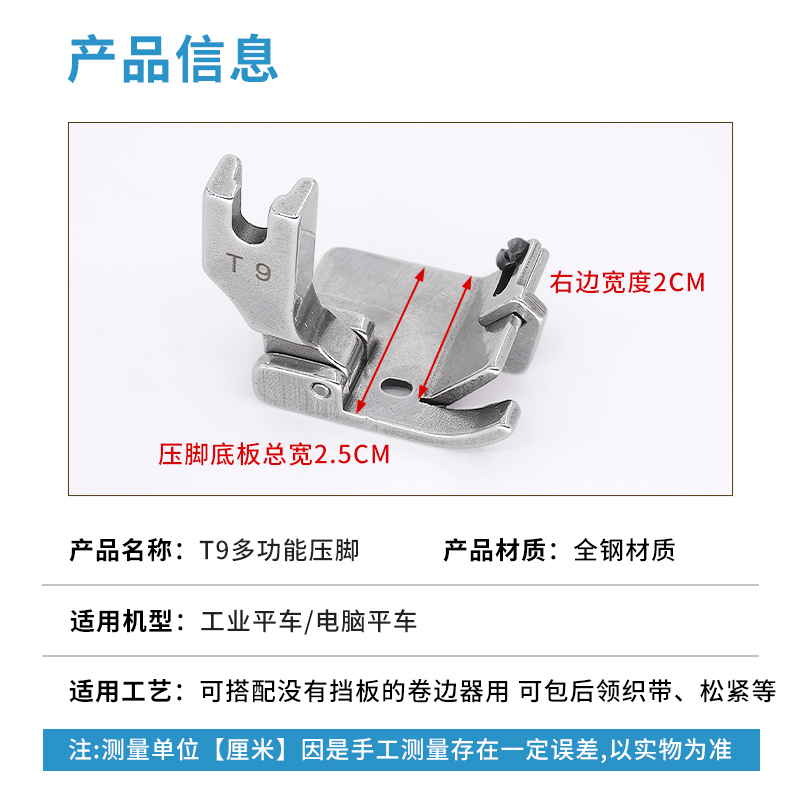 新款T9压脚包边包后领织带卷边折边平车通用可调多功能压脚配件