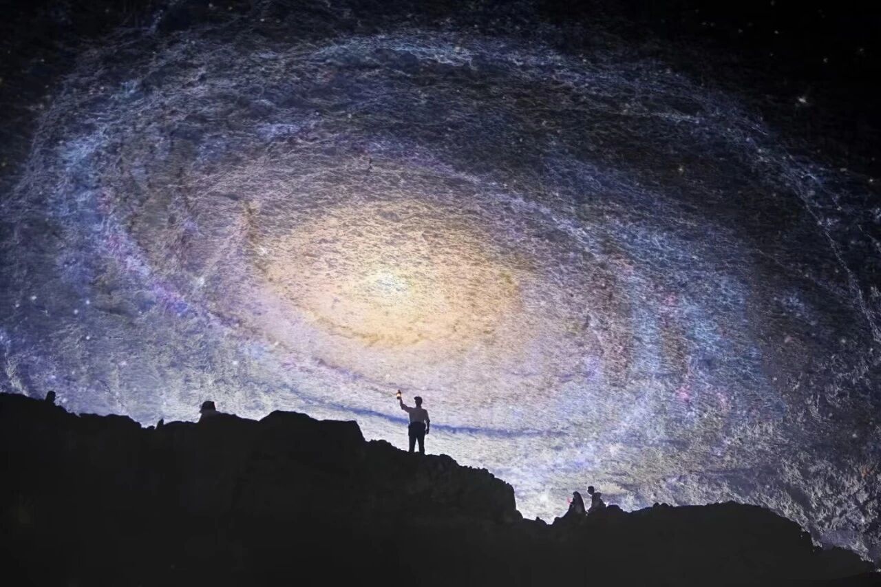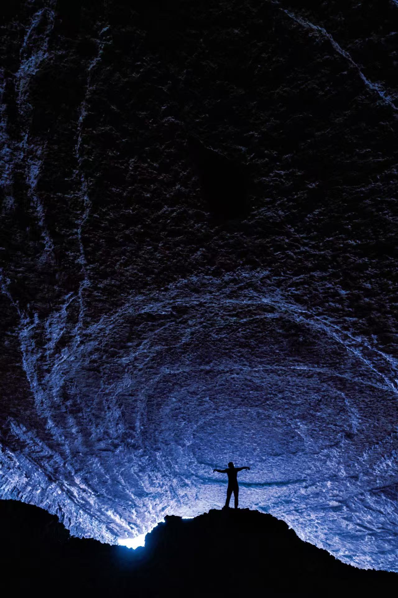 洞顶因流水侵蚀形成密集的凹凸纹理,在特定光线下折射出银白、深蓝与赭红交织的光晕,宛如银河倾泻而下,因此被人们称为“宇宙穹顶”。