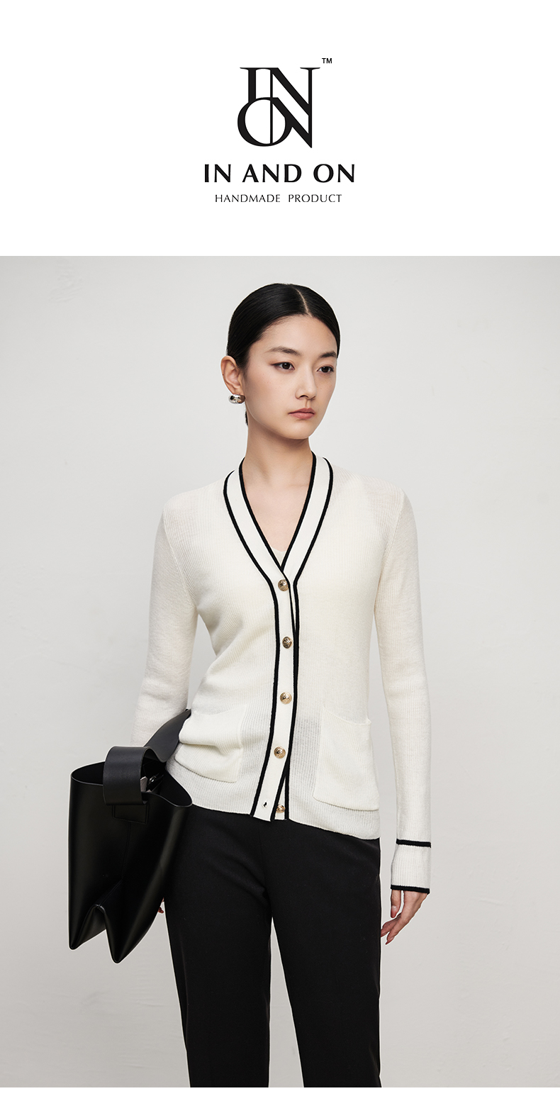 【品牌优选】【合作直发】IN AND ON2023春季季新款小香风修身金属扣撞色V领开衫毛衣