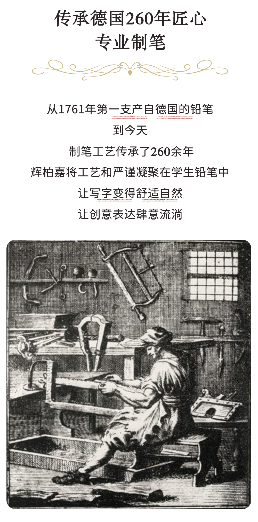 - 德国辉柏嘉,始创于1761年的家族品牌,历经259年岁月洗礼的制笔权威,一直致力于提供高品质书写及绘画艺术创作工具的专业制造商。