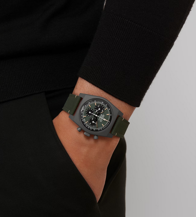 镜面 材质 | 蓝宝石水晶玻璃 | 表盘 | 微喷砂钛金属元素表壳 深绿色表盘、黑色时标及米色荧光指针和时标背透 |