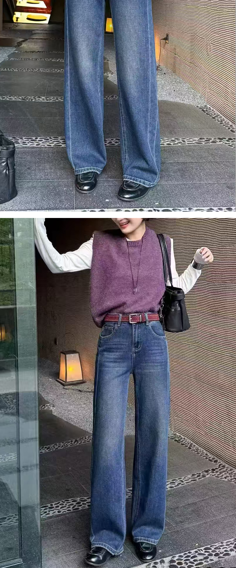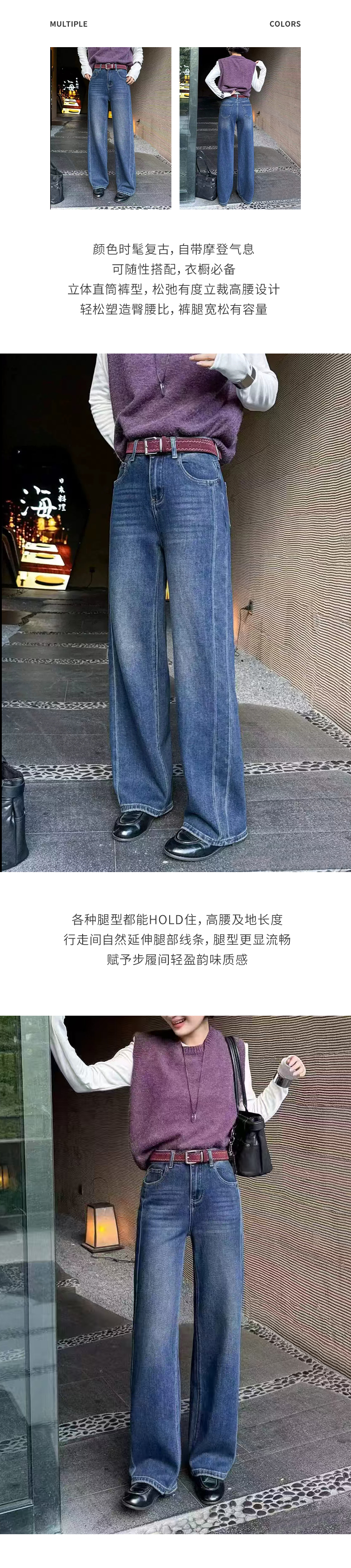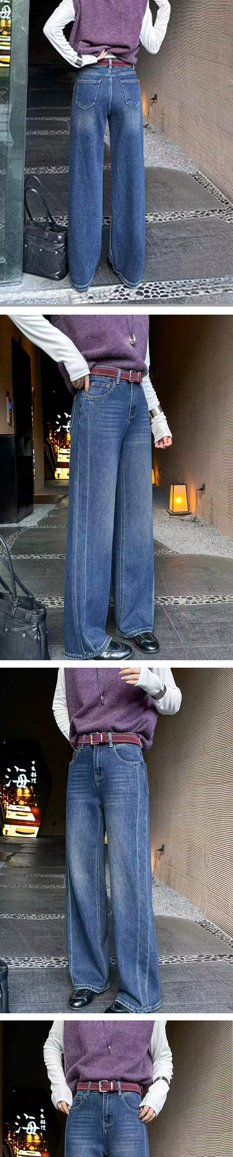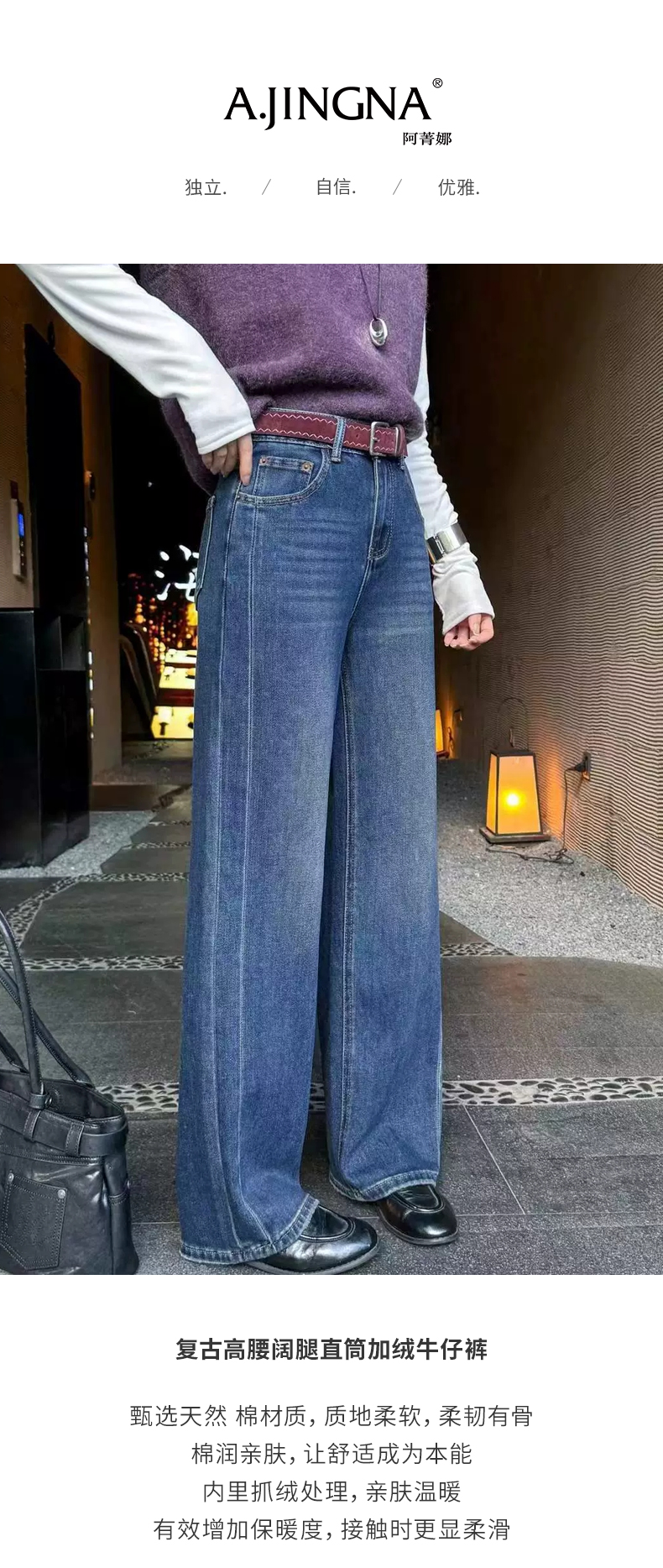 【加绒牛仔裤】阿菁娜冬季新款加绒牛仔裤高腰阔腿云朵绒内里保暖复古直筒长裤F30D210016