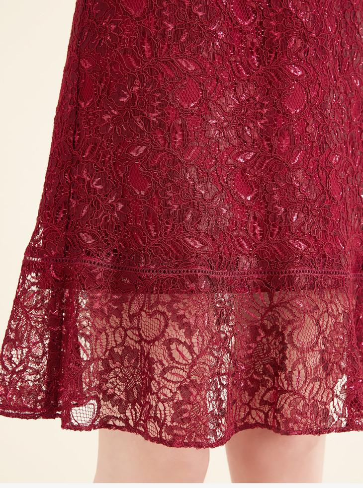 皮尔卡丹女装酒红色蕾丝喇叭袖V领连衣裙显瘦气质短袖A字裙减龄装