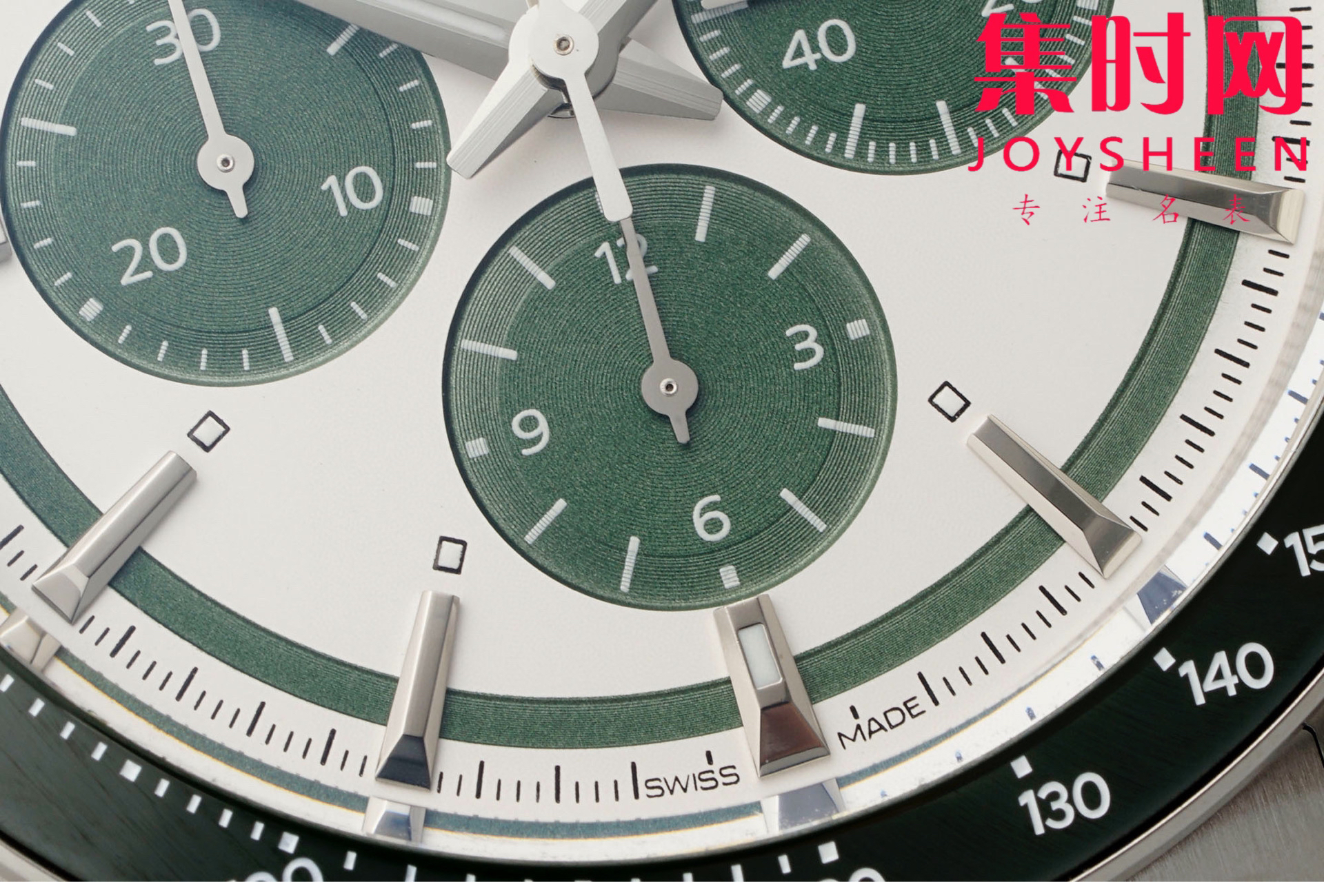 表盘有黑、白、蓝、香槟,多种配色,黑色的三眼计时盘和黑色陶瓷圈,同样有"熊猫盘"的神韵。虽然康卡斯计时的表盘,整体走现代风格,但盘面外侧的一圈扭索纹黑圈,让手表有了那么一点儿"sector dial"(分区表盘)的复古味道。同时,在每个条形立体时标的前端,都有一个小小的夜光点。这种设计在上世纪90年代、21世纪初的名表上,经常能见到,这又为新款康卡斯计时表带来了一些复古气息。