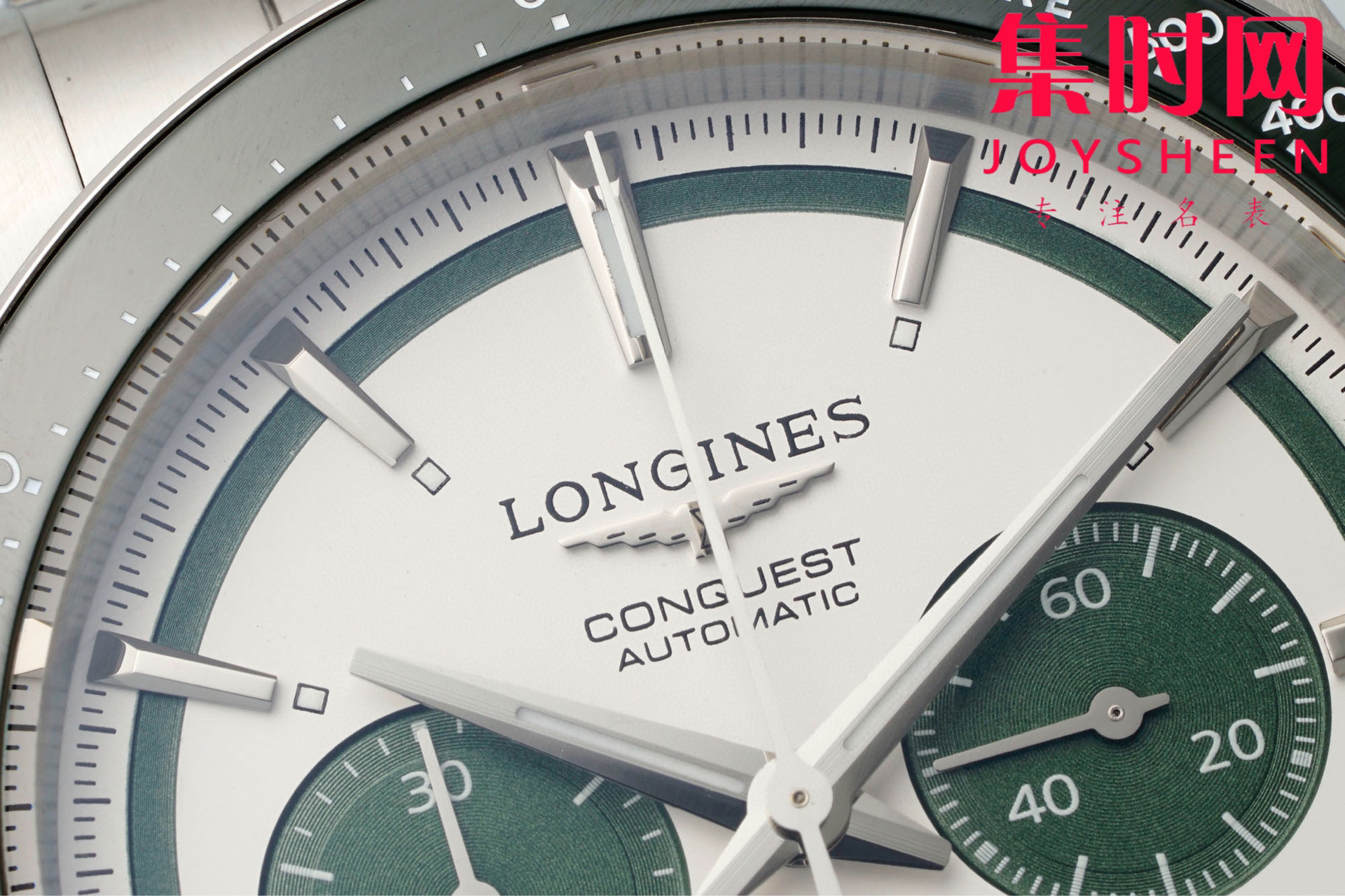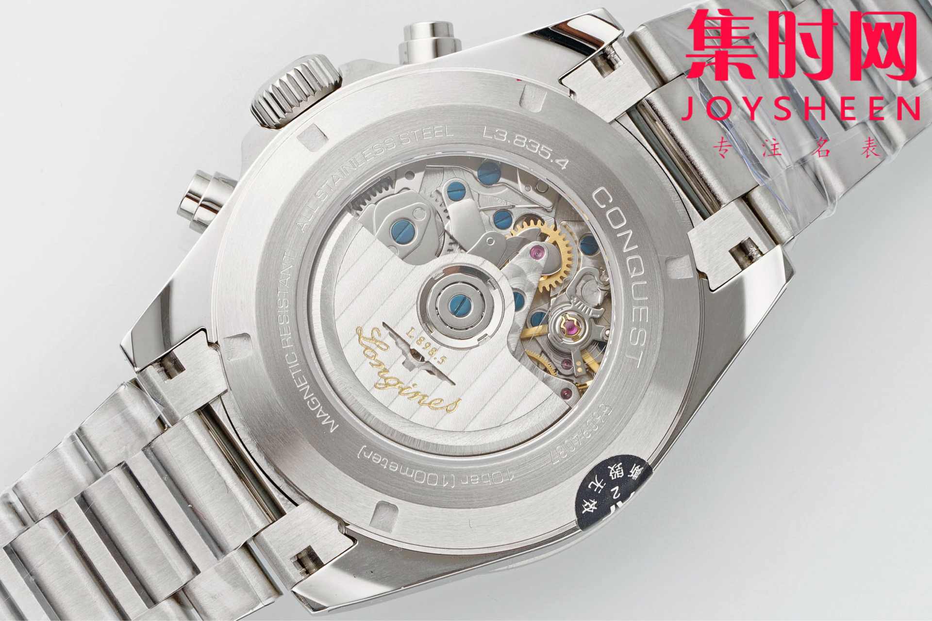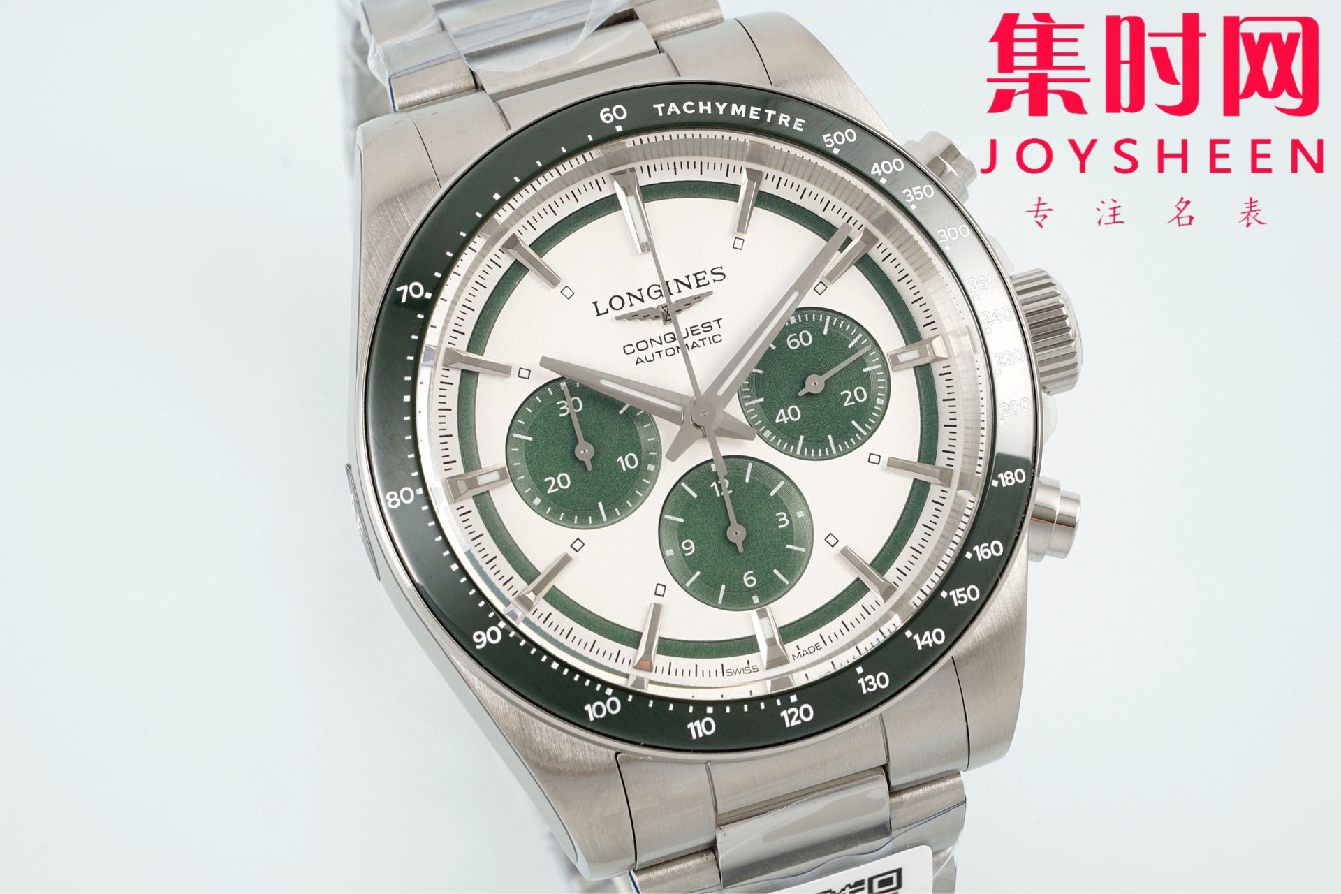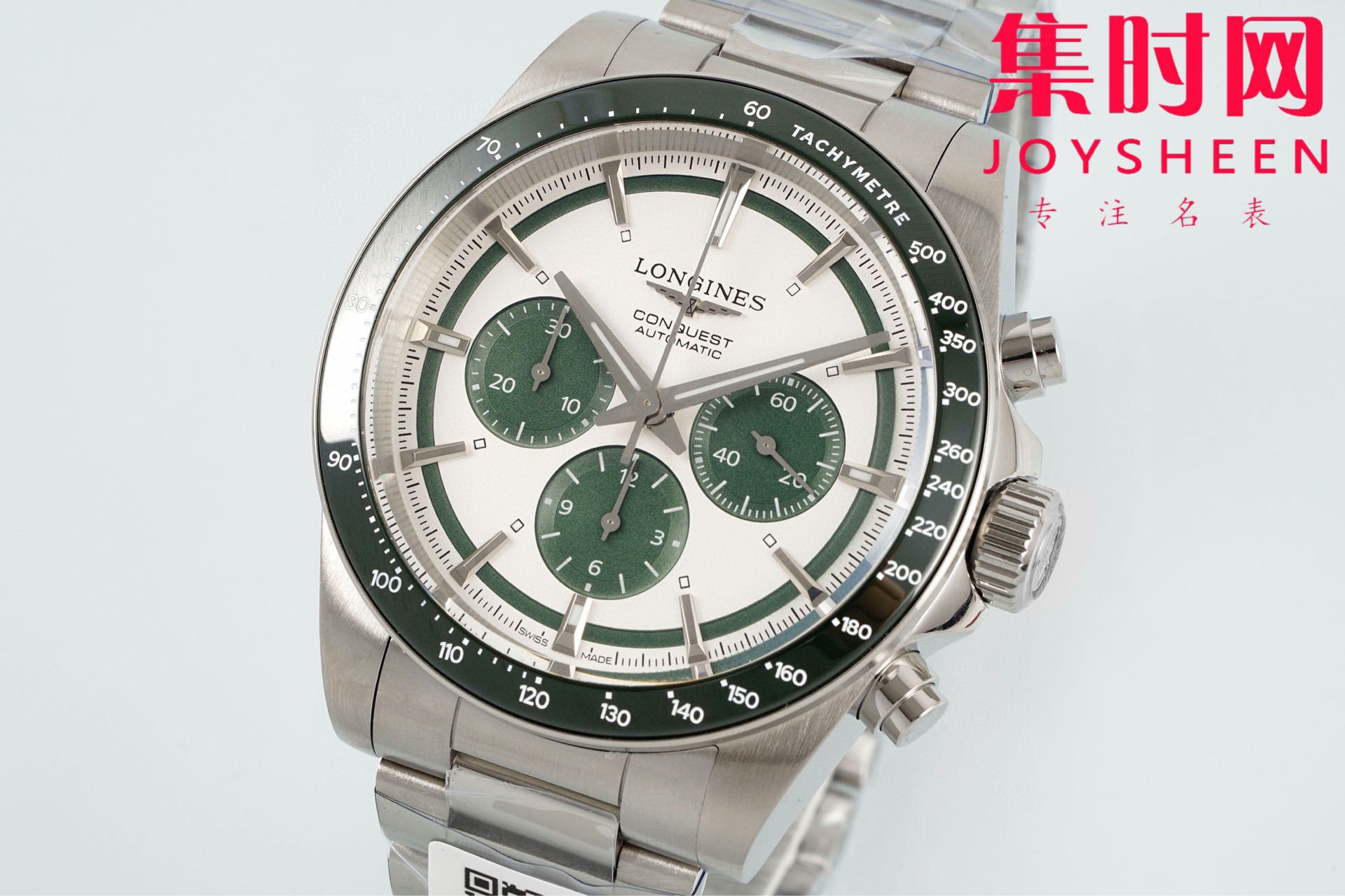 AF浪琴康卡斯计时系列 康卡斯悦动计时 男士腕表 钢带款 表径42mm,使用陶瓷表圈,表圈上有有测速圈,并有红字点缀。