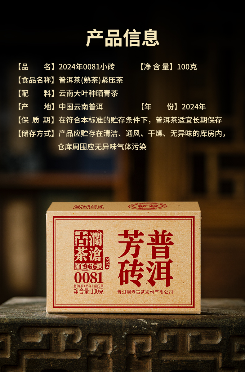 【拍1发4】澜沧古茶2024年0081芳砖普洱茶熟茶小砖茶100g