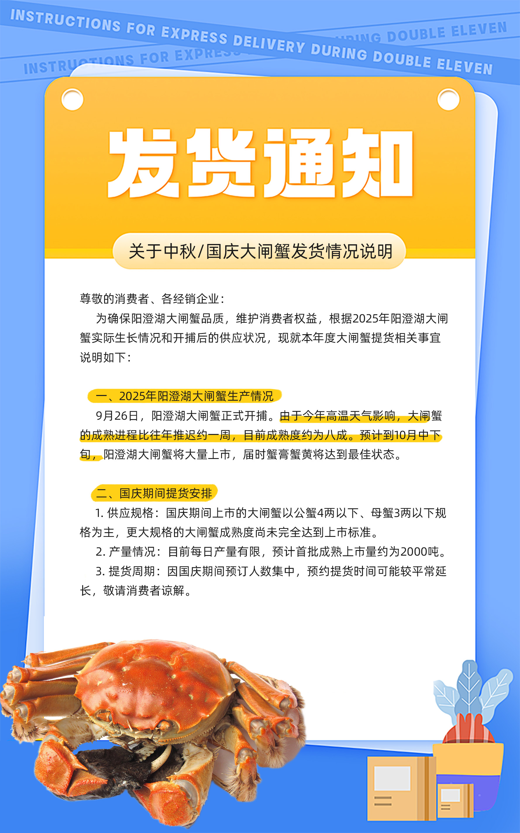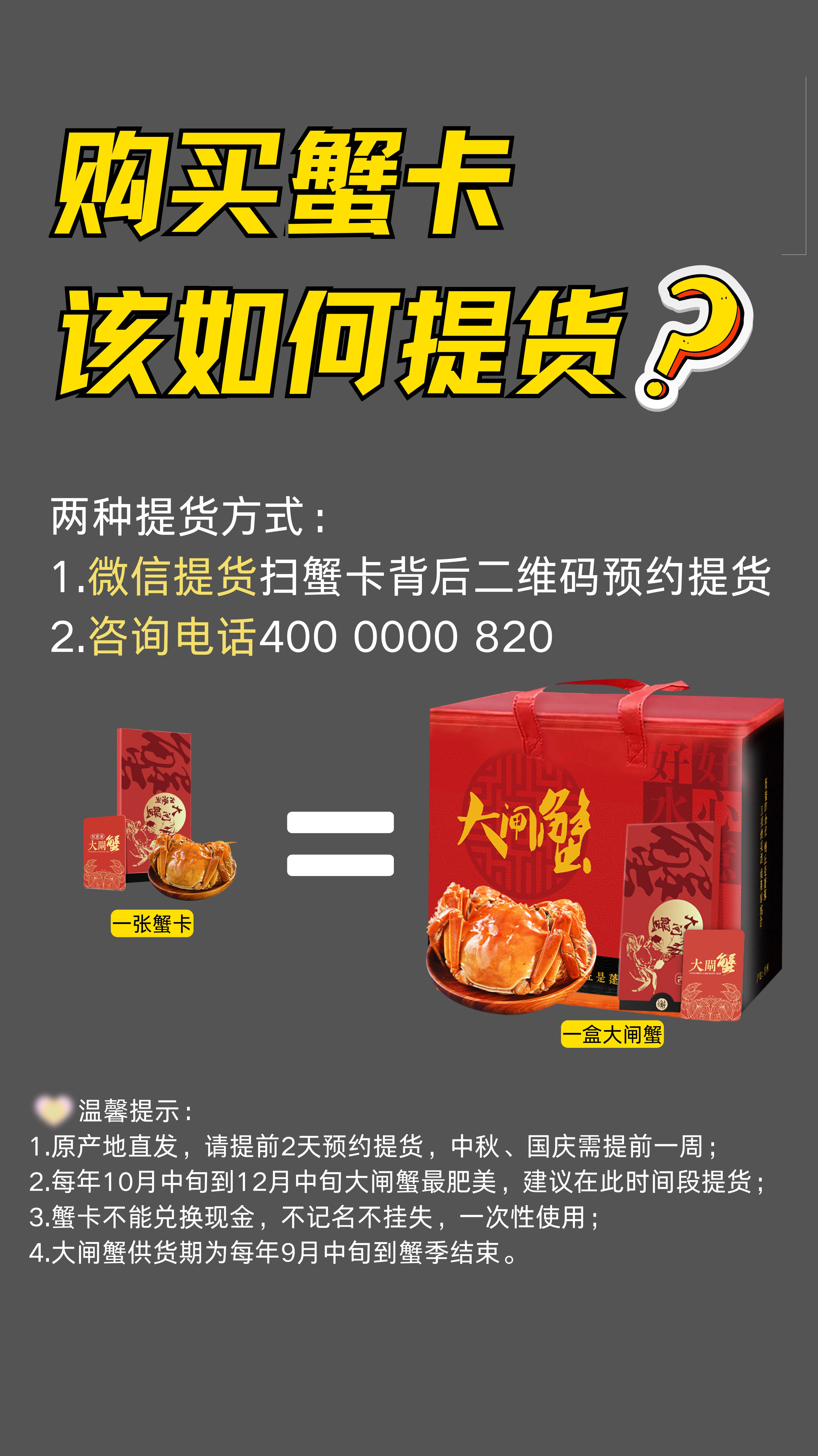 4,此链接发蟹卡,开湖兑换螃蟹预计9月26日左右起提货。