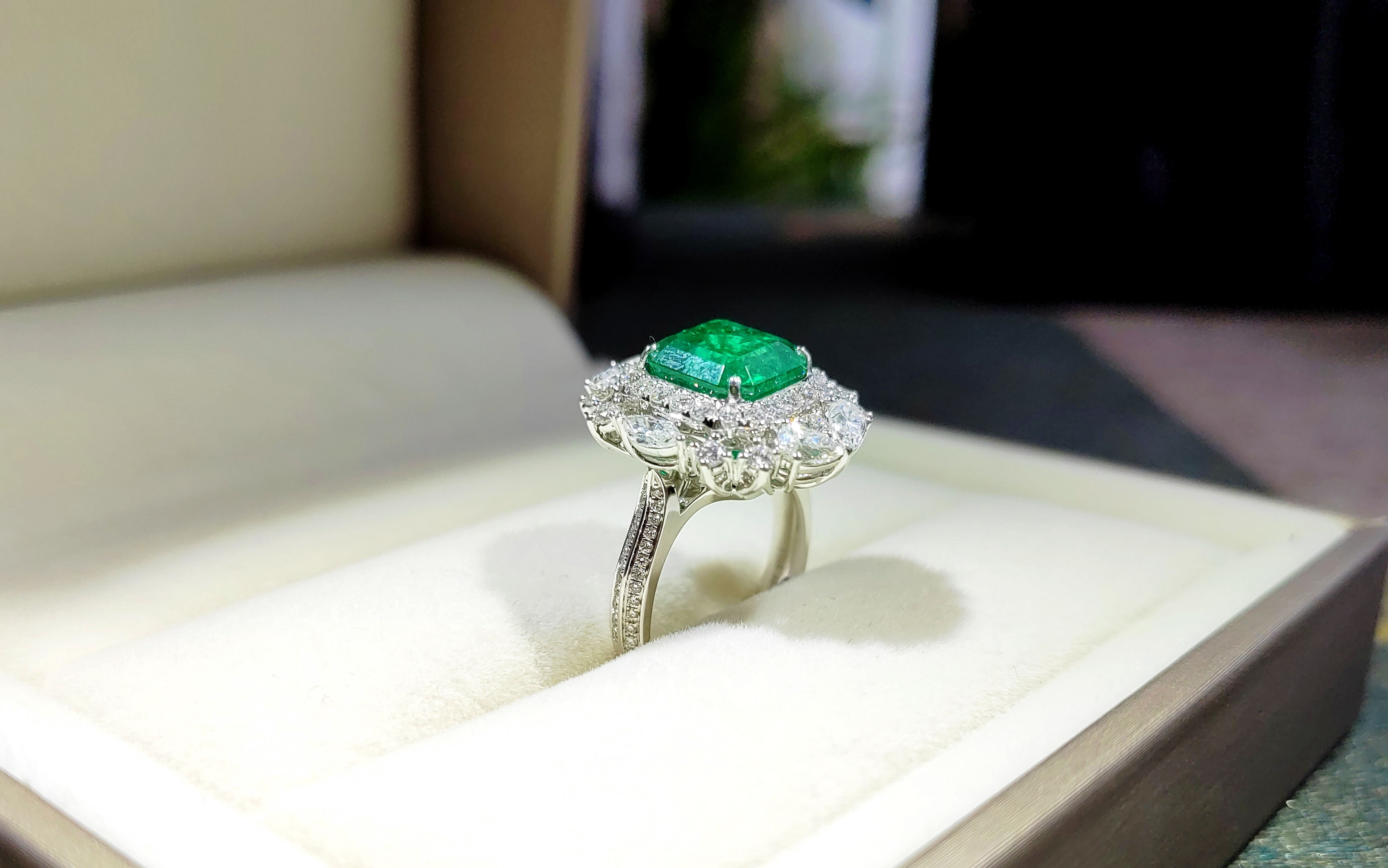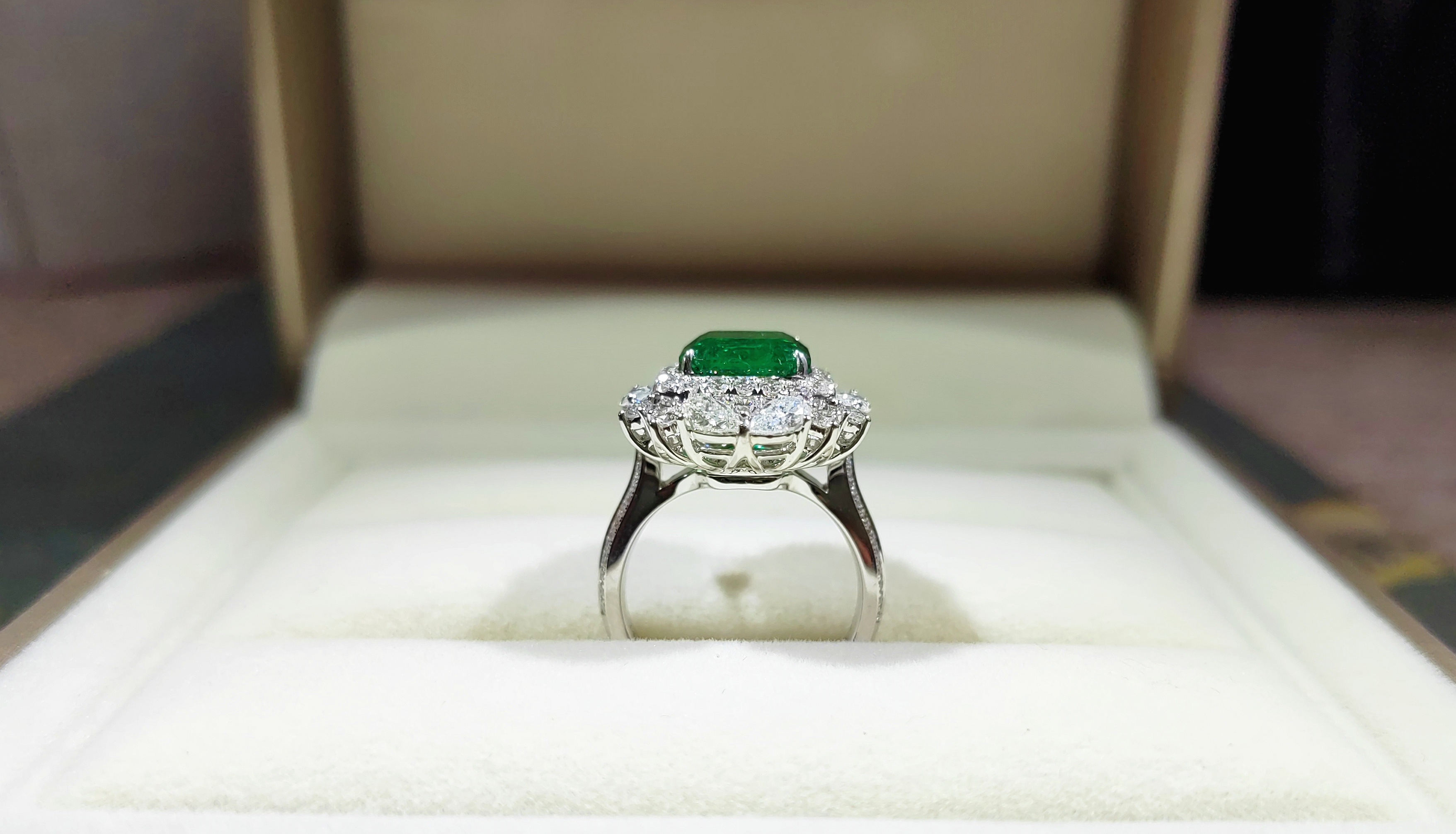 祖母绿号称包裹体的后花园,内部净度往往差强人意,而这颗主石采用标准祖母绿八角切工,肉眼几乎全净,火彩尤为璀璨。