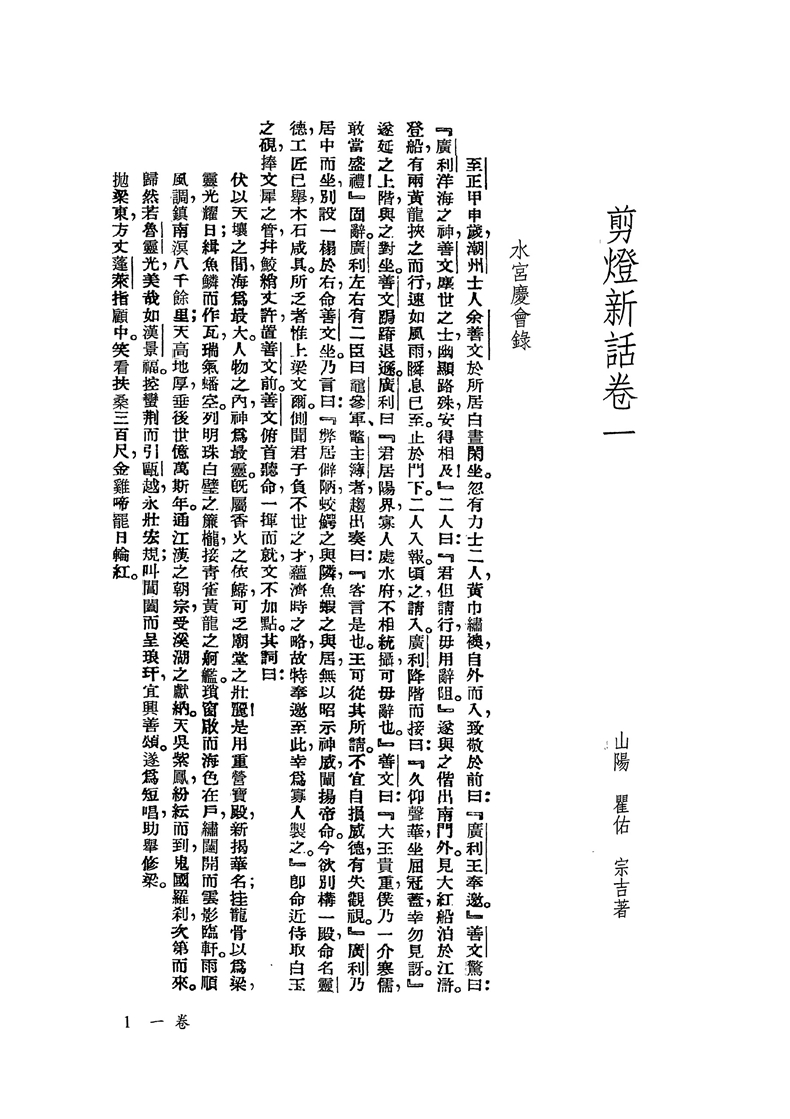 《剪燈新話》為明筆記小說,共四卷。含「水宮慶會錄」、「三山福地志」、「天台訪隱錄」、「牡丹燈記」、「翠翠傳」、「鑑湖夜泛記」、附錄「秋香亭記」等。《剪燈餘話》,廬陵李昌祺編撰,共五卷。含「長安夜行錄」、「連理樹記」、「鳳尾草記」、「洞天花燭記」。