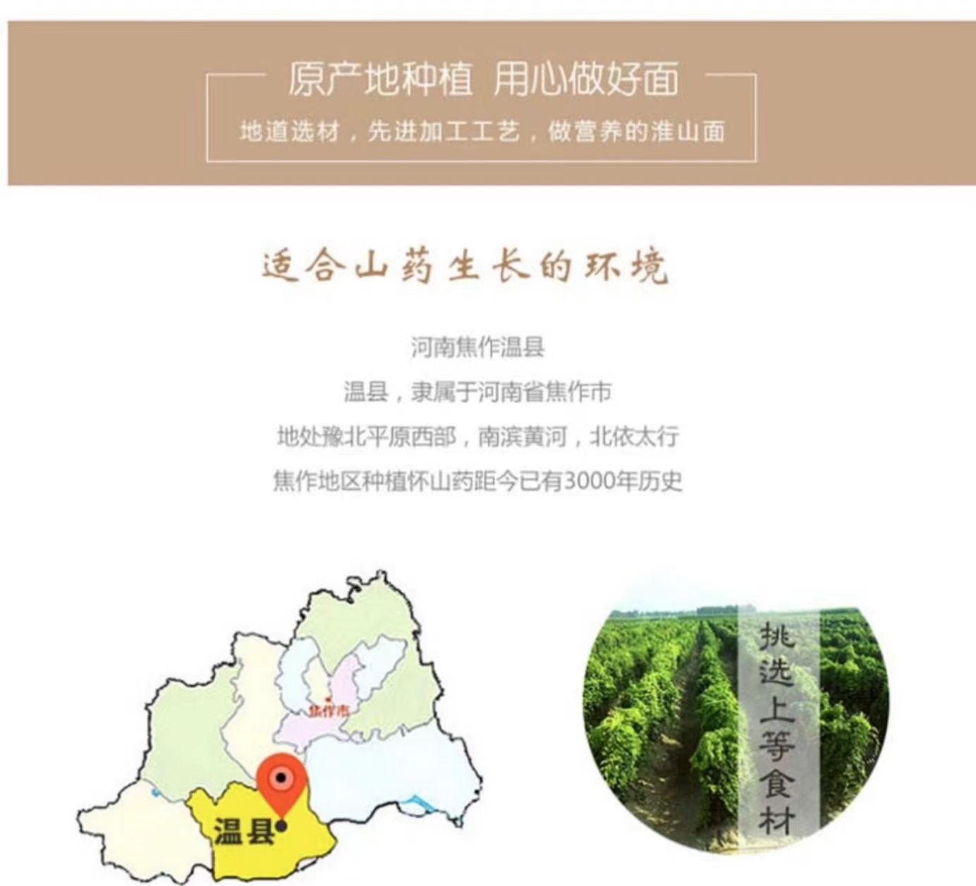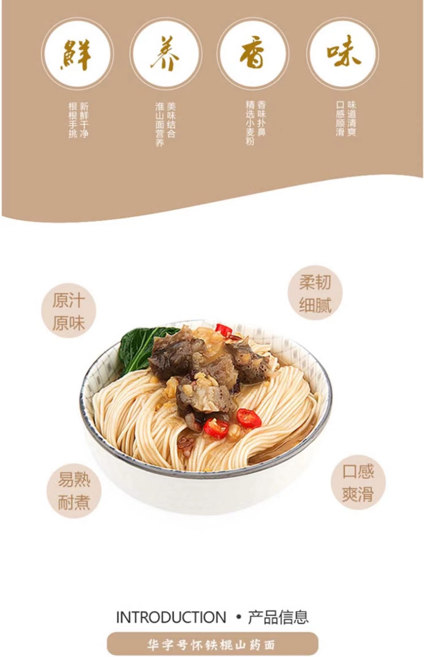 1、采用黄河北岸温县优质小麦粉和怀府铁棍 山药制作而成;易熟耐煮,口感软滑