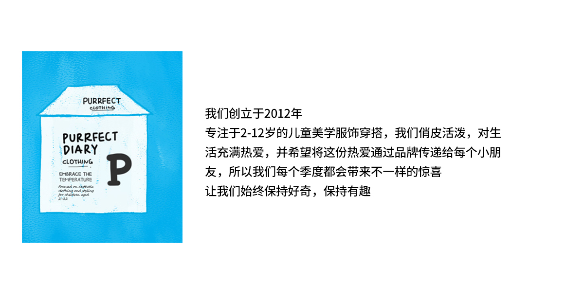 - Purrfect-Diary专注于贴近自然随性的穿着概念,轻奢平价的童装文化传播,在产品设计上更加注重婴童穿着的舒适性、安全性、更出众的国际化品牌,将欧美的育婴文化在中国进行深入的传播与推广。
