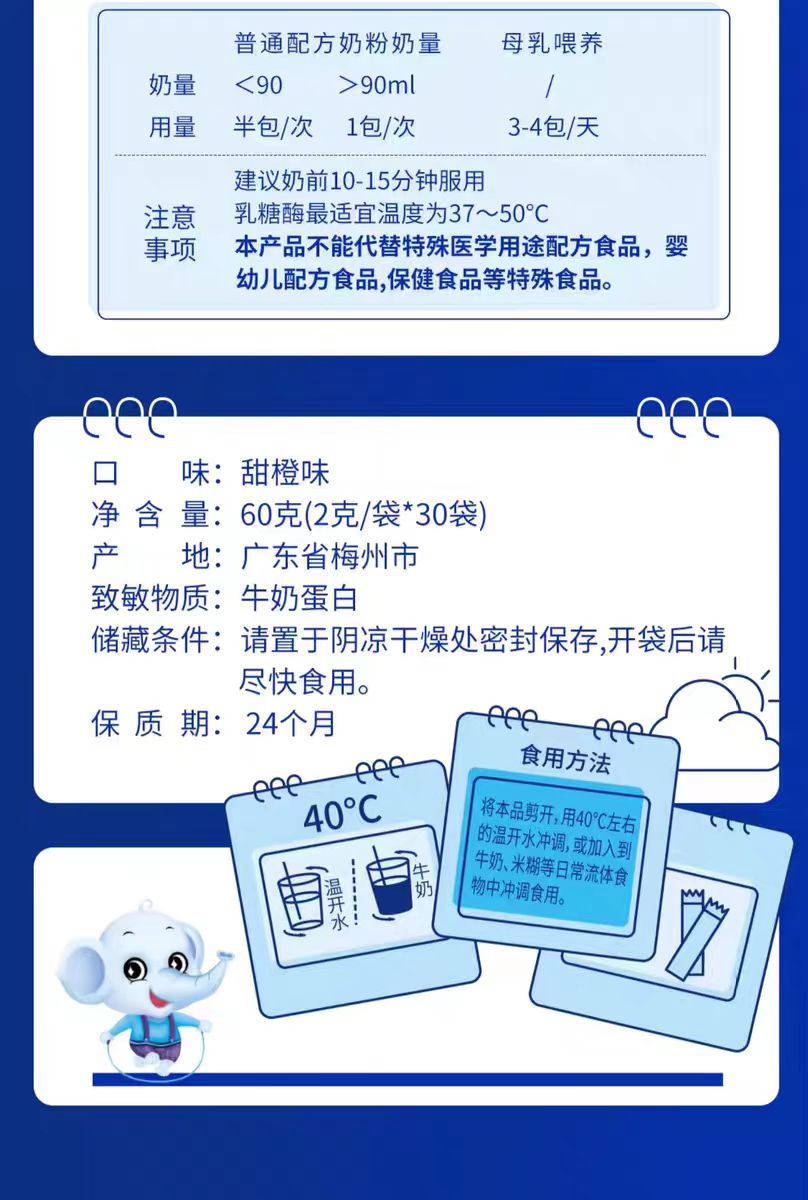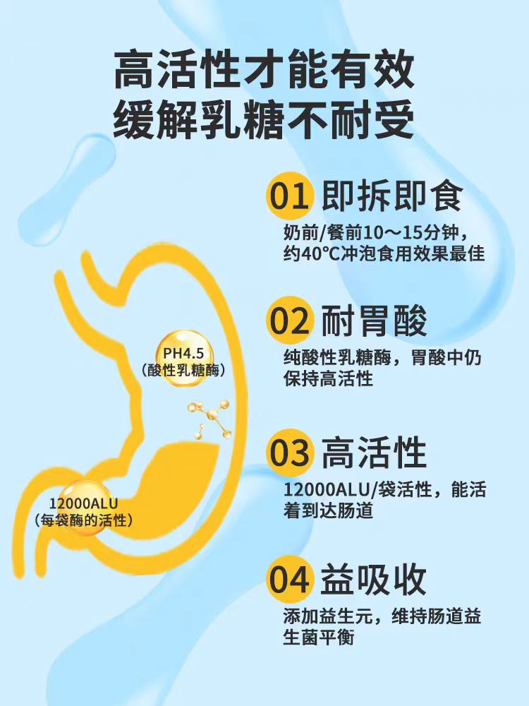 特别注意:乳糖酶都需要在奶前2-5分钟单独喝,特别不与奶冲调一在一起,奶后饮用无效果。