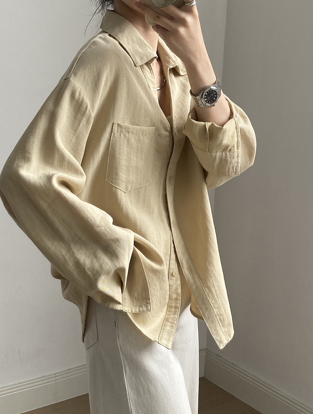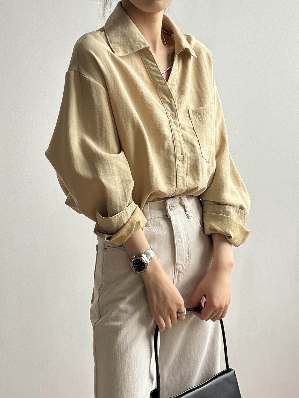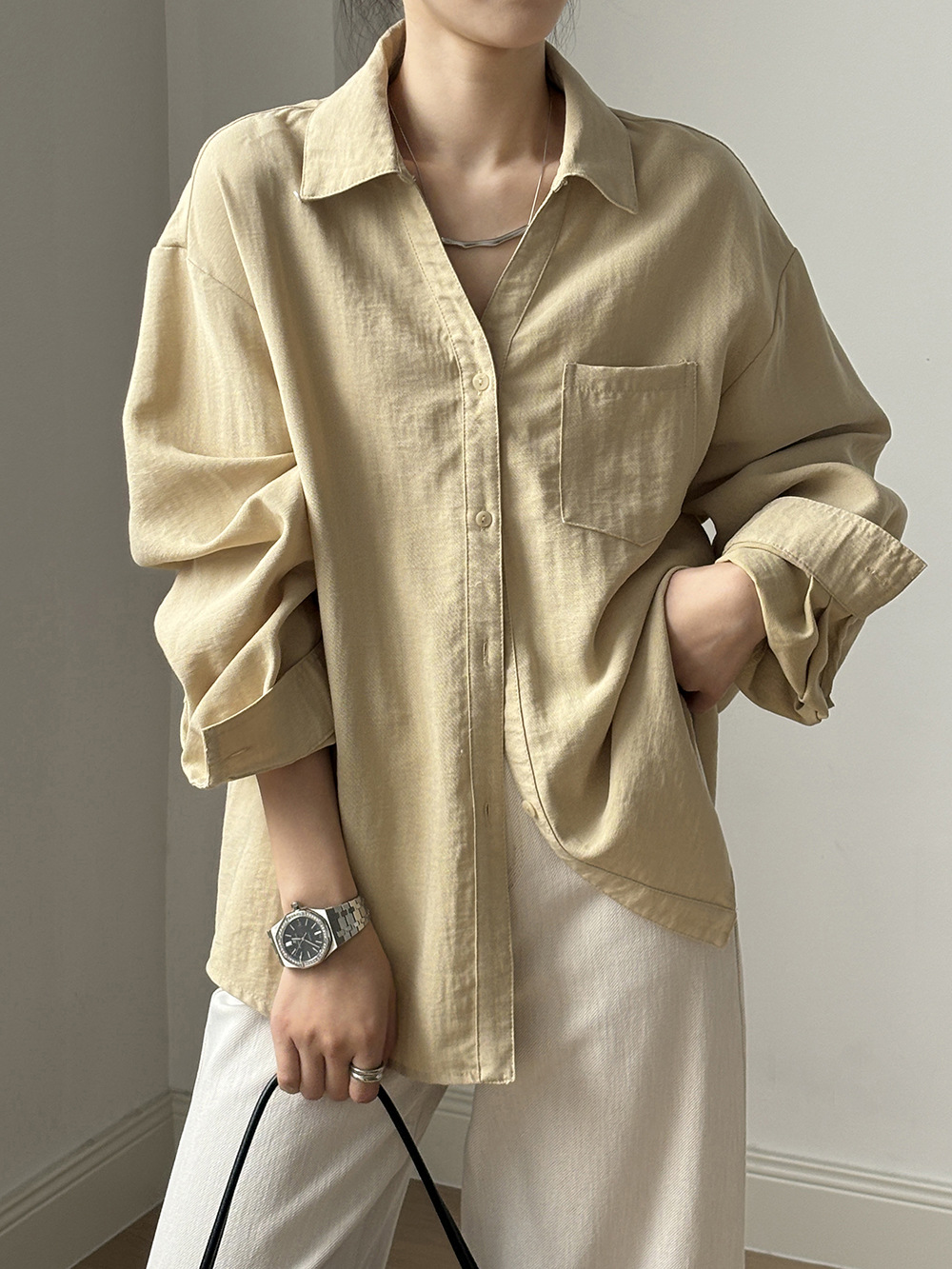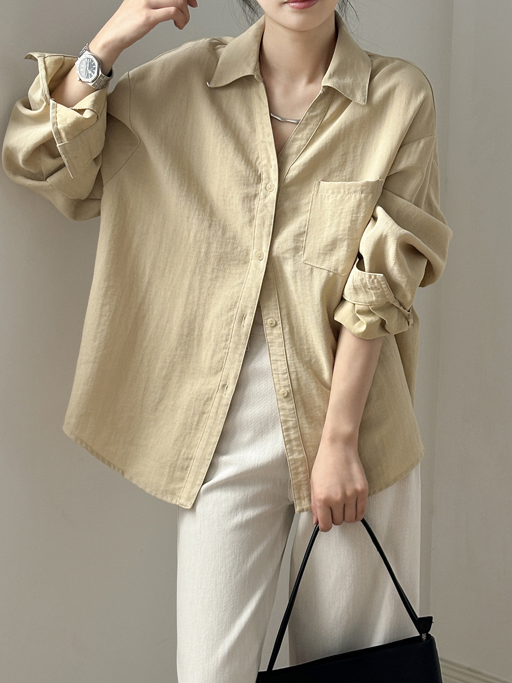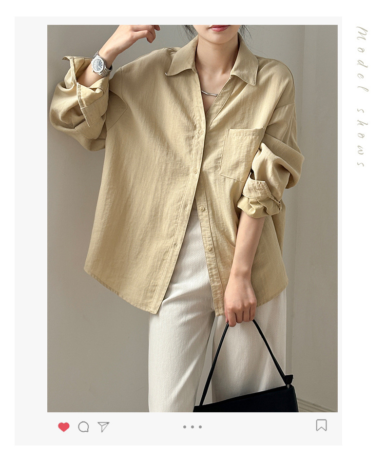 【专柜品牌品质】亚麻天丝棉V领衬衫 春夏季简约休闲长袖宽松上衣82209