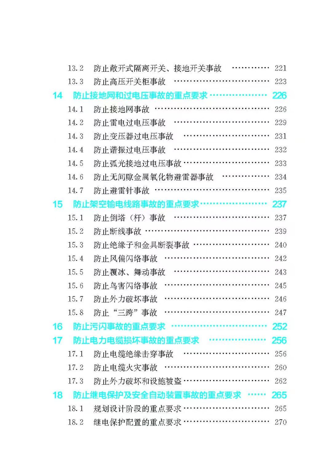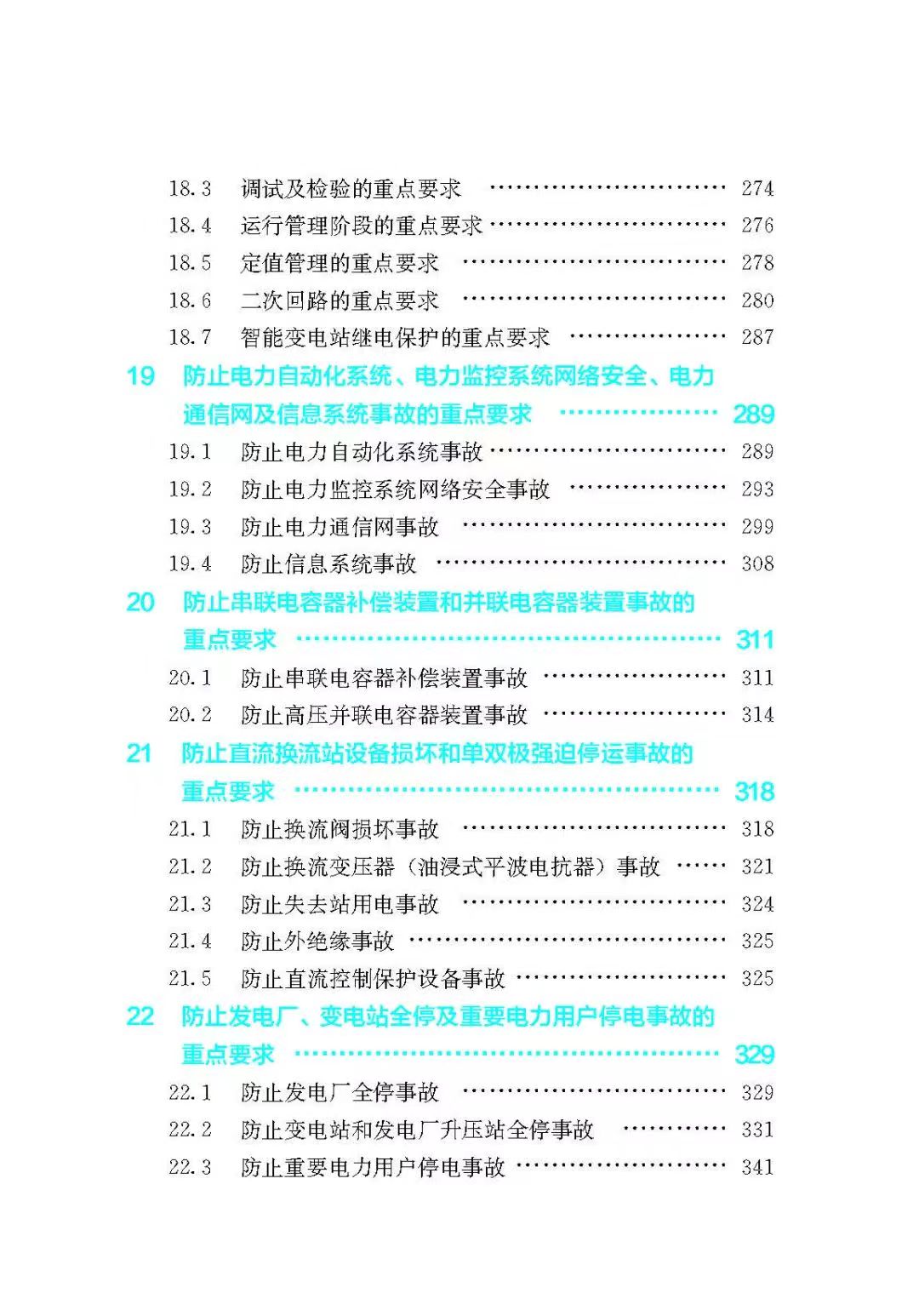 本书列出了防止人身伤亡事故,火灾事故,电气误操作事故,系统稳定破坏事故,机网协调及风电机组和光伏逆变器大面积脱网事故,锅炉事故,压力容器等承压设备爆破事故,汽轮机和燃气轮机事故,分散控制系统控制失灵事故,发电机及调相机损坏事故,发电机励磁系统事故,大型变压器损坏和互感器损坏事故,开关设备事故,接地网和过电压事故,架空输电线路事故,污闪事故,电力电缆损坏事故,继电保护及安全自动装置事故,电力自动化系统、电力监控系统网络安全、电力通信网及信息系统事故,串联电容器补偿装置和并联电容器装置事故,直流换流站设备损坏和单双极强迫停运事故,发电厂、变电站全停及重要客户停电事故,水轮发电机组(含抽水蓄能机组)事故,垮坝、水淹厂房及厂房坍塌事故,重大环境污染事故等二十五项重点要求及其编制释义。