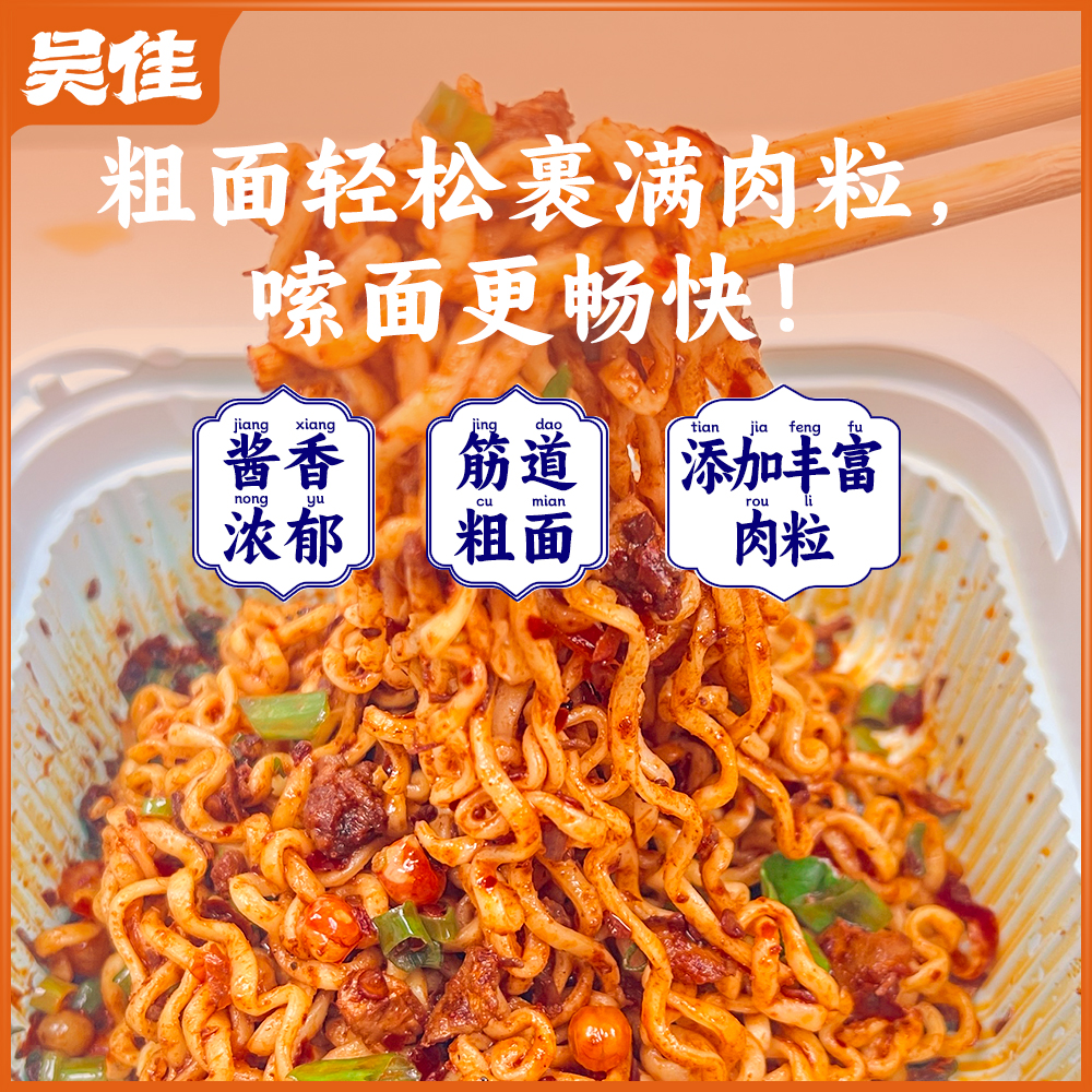 碗装拌面(中辣/微辣)规格:鸡肉/牛肉酱1罐50克+面饼1袋125克+豆子1包10克+酸豇豆1包20克+酱油1包5克=210克(1碗为1人份量)