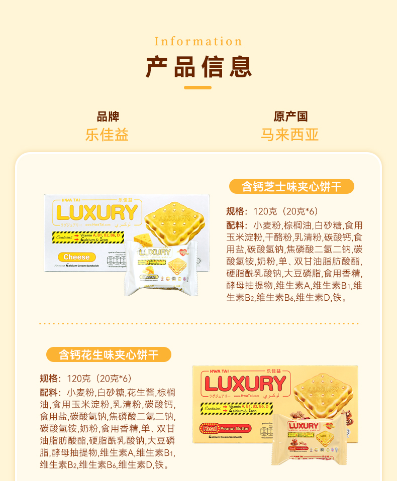 华大乐佳益含钙花生味/芝士味夹心饼干120g 口感细腻奶香浓郁