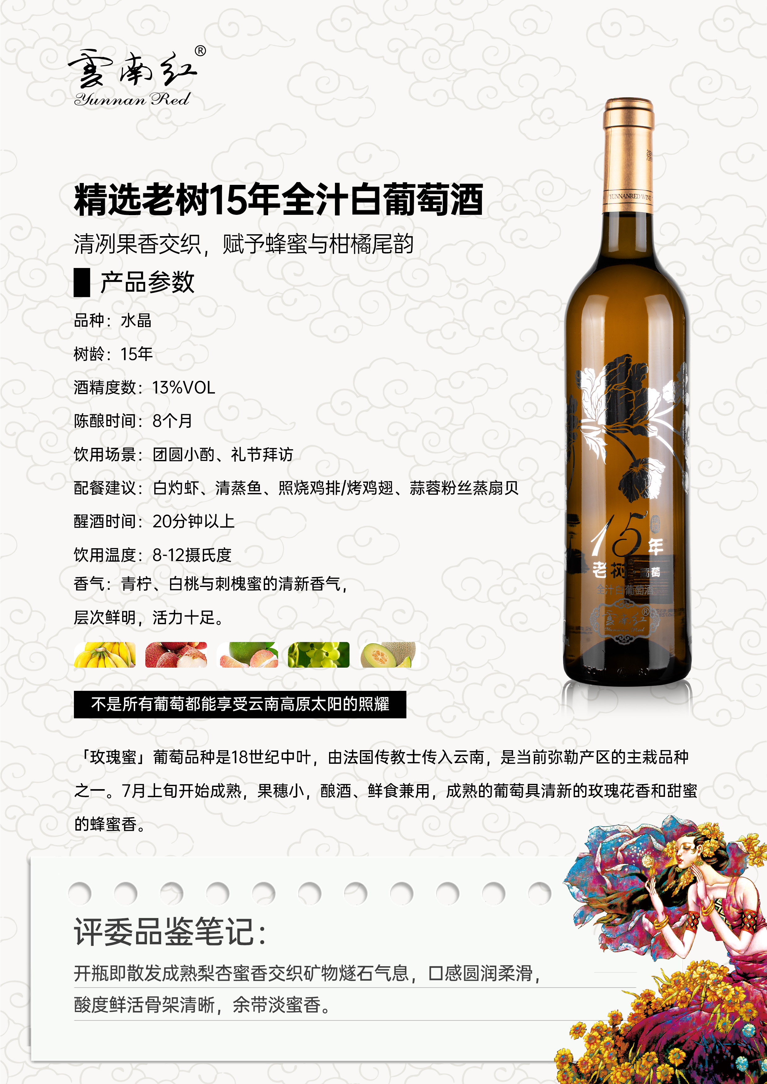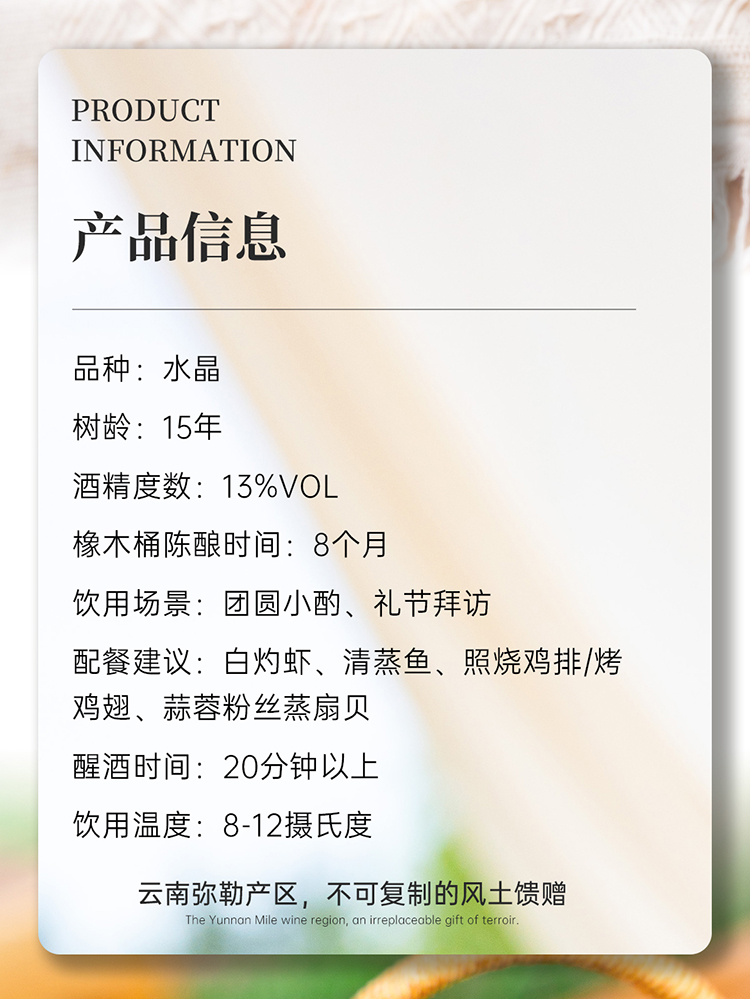 云南红精选老树15年水晶全汁白葡萄酒13度750ml弥勒酒庄