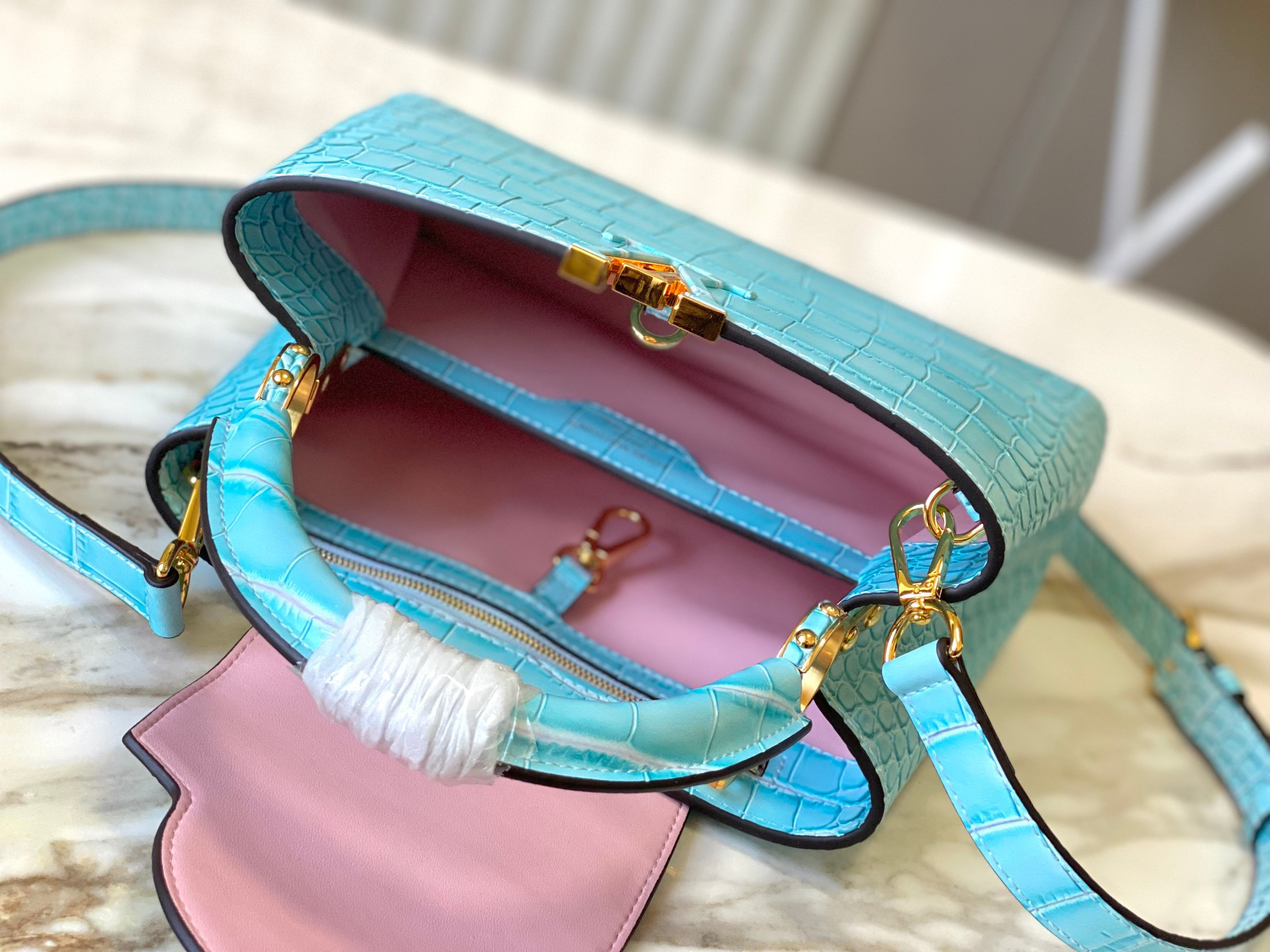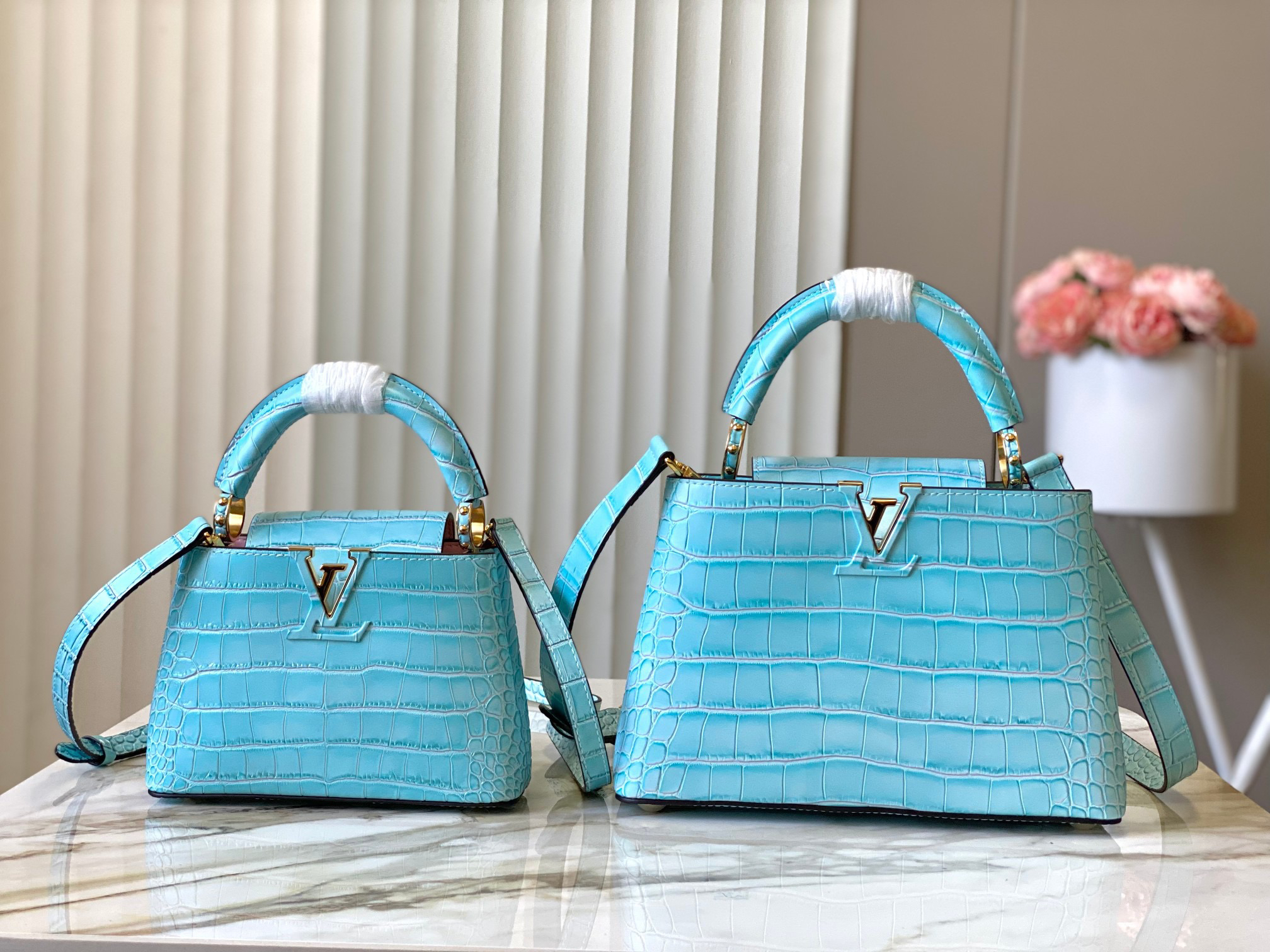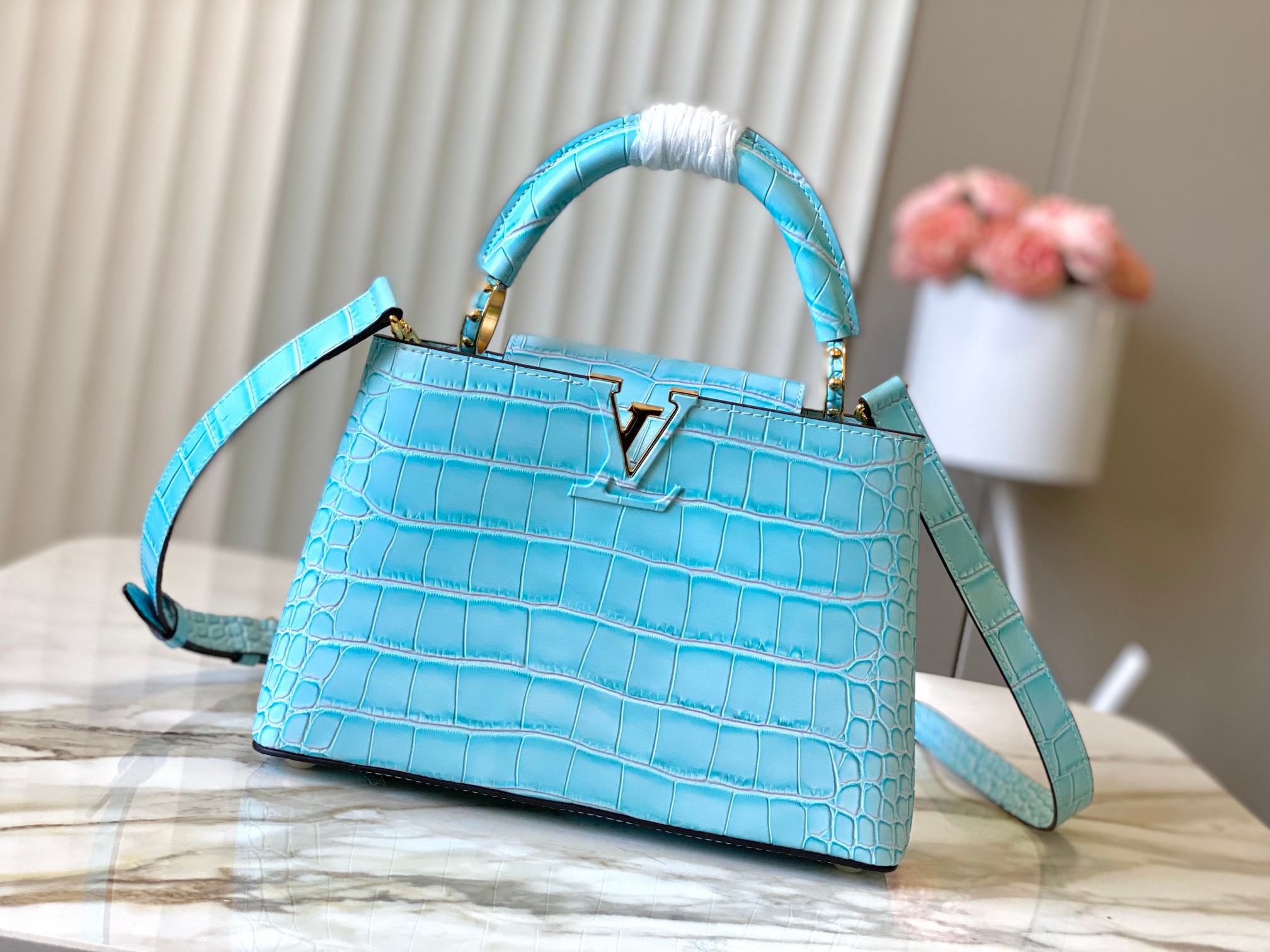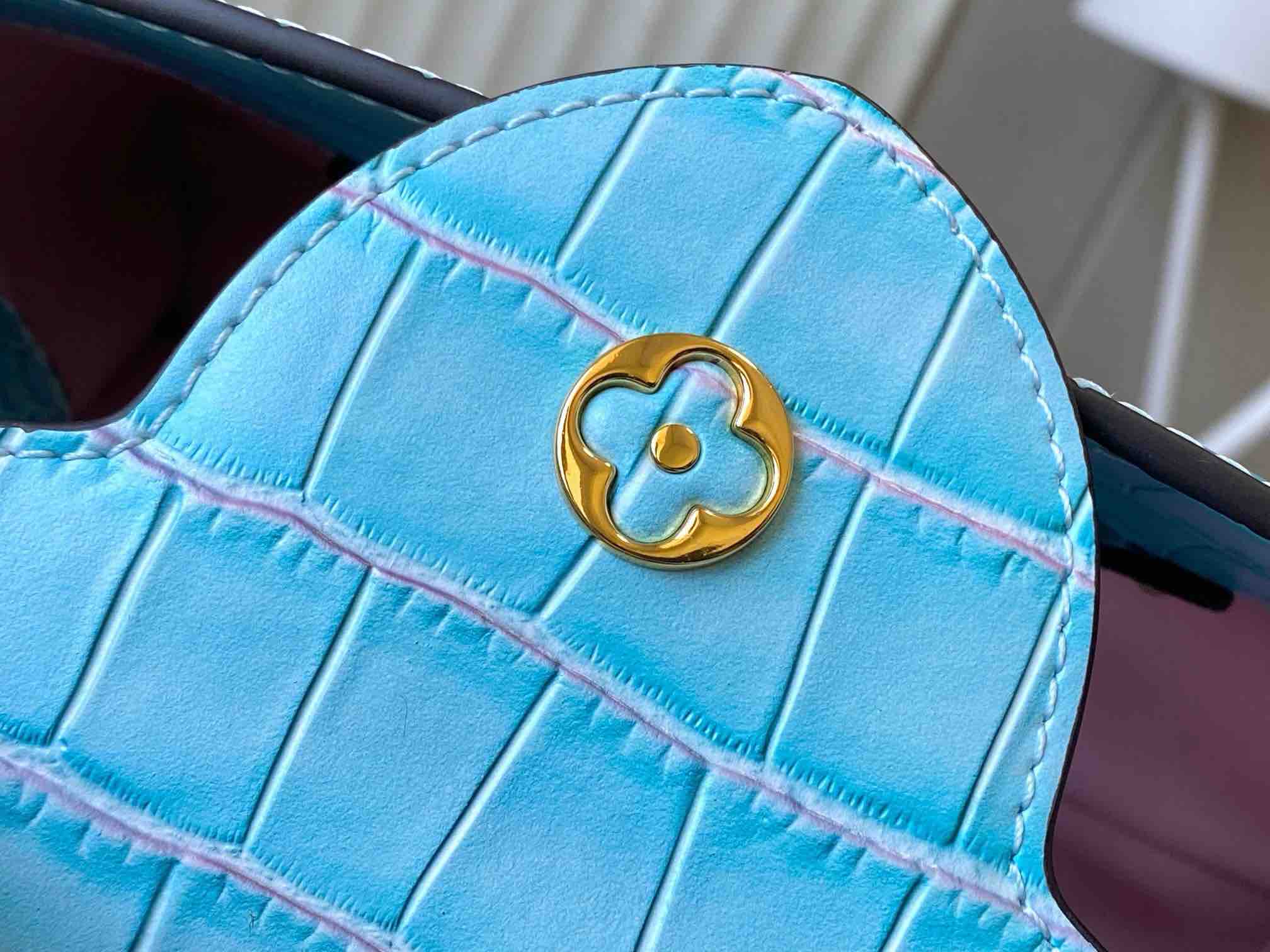 秋冬特惠💰1530 渠道级LV 新品 te级LV N93163/M48865蓝鳄鱼纹 此款珍贵的Capucines手袋由鳄鱼皮纹 经上高光处理 闪耀迷人 奢华的山羊皮衬里与闪闪发光的金属饰件 特有的Capucines搭盖既可收入包内 展示字母标识 又可外翻 呈现Monogram Flower图案 出行的理想配饰 Size: 27 * 18 * 9 CM