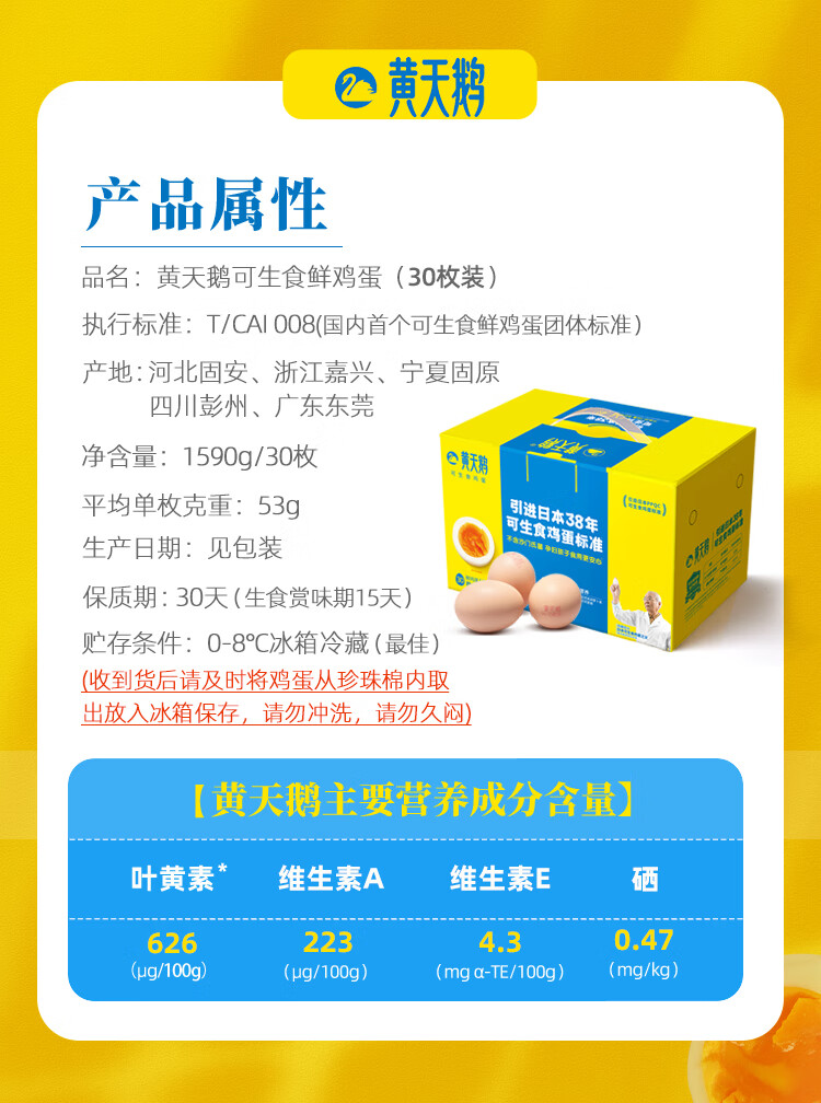 黄天鹅达到日本可生食鸡蛋标准 30枚鲜鸡蛋 1.59kg/盒 中秋礼盒装