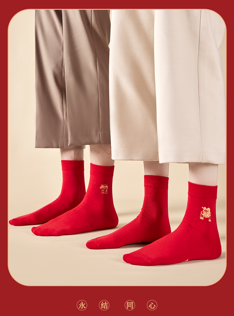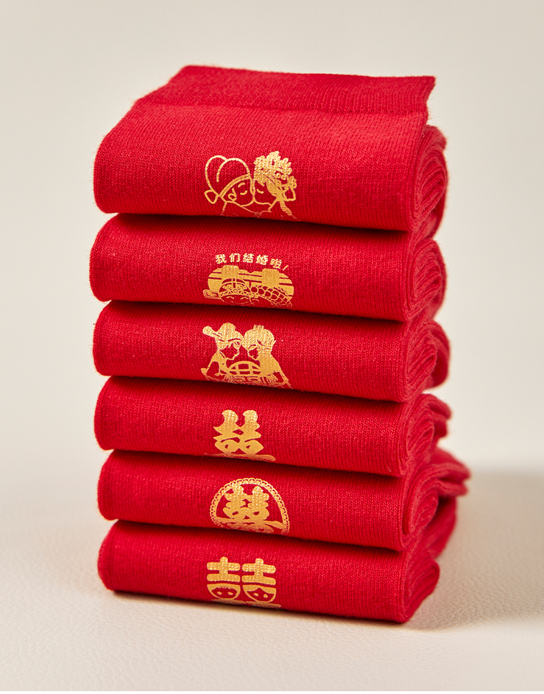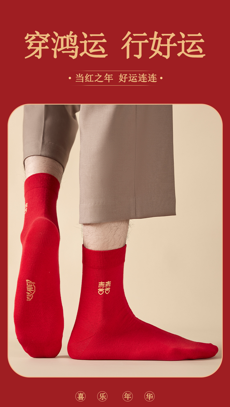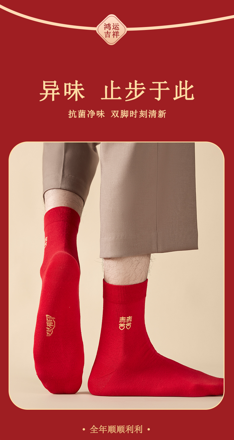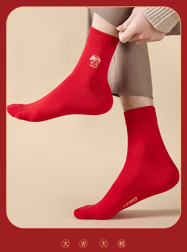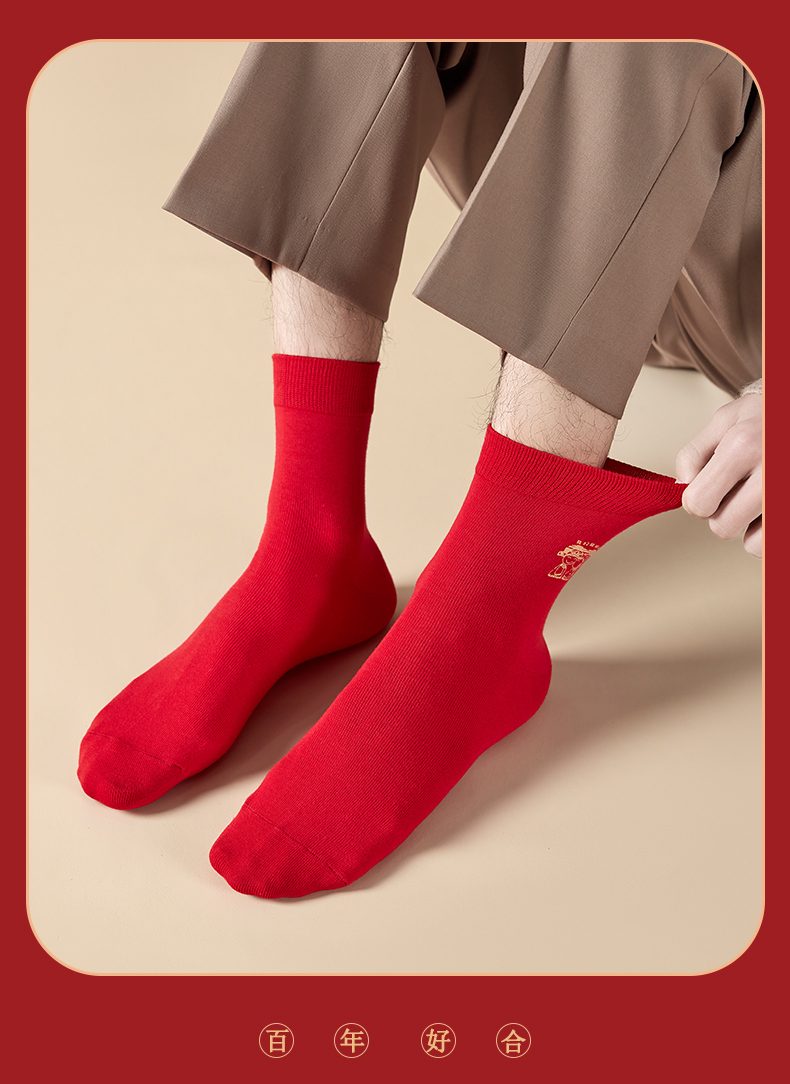 洁丽雅6双鸿运男袜纯棉大红喜庆中筒男袜大红袜子结婚袜子男