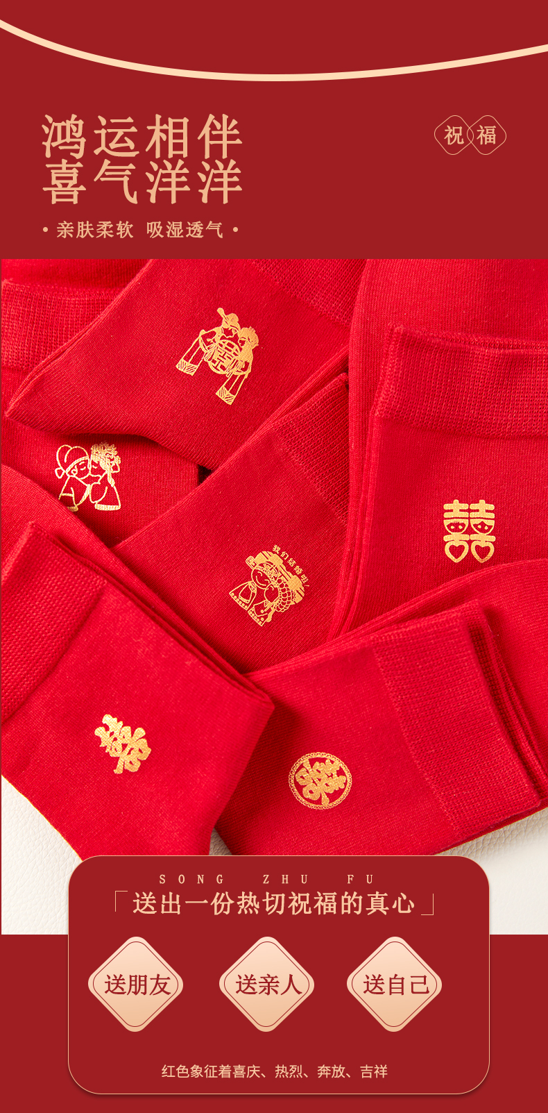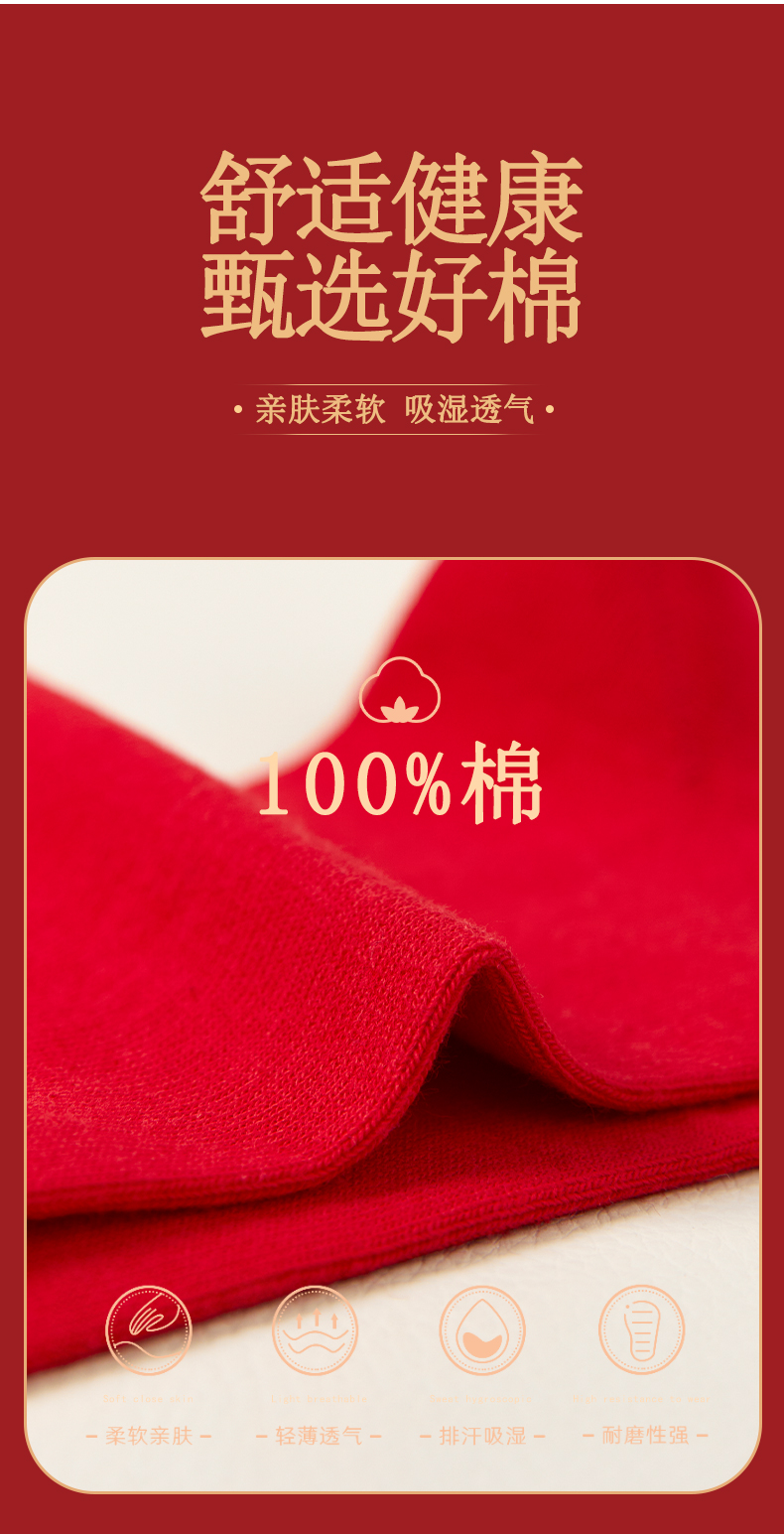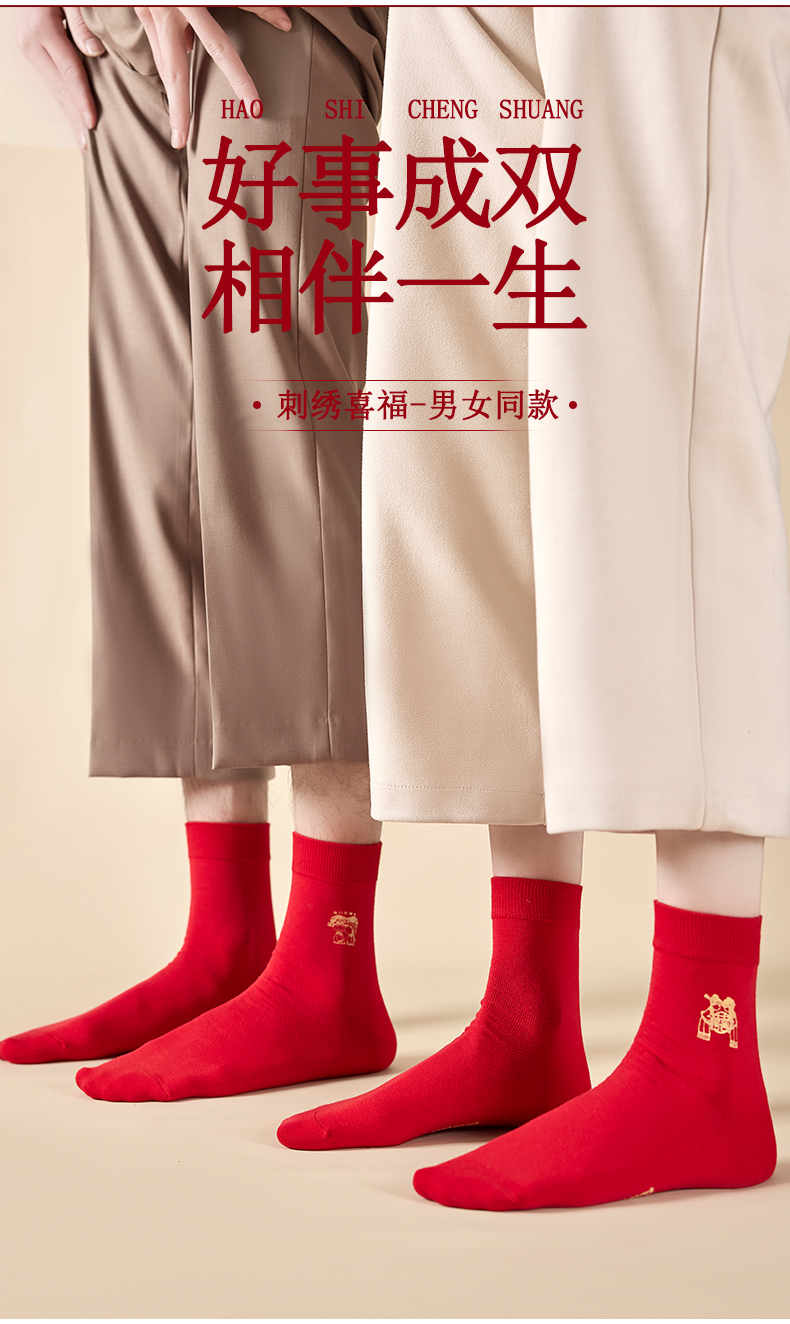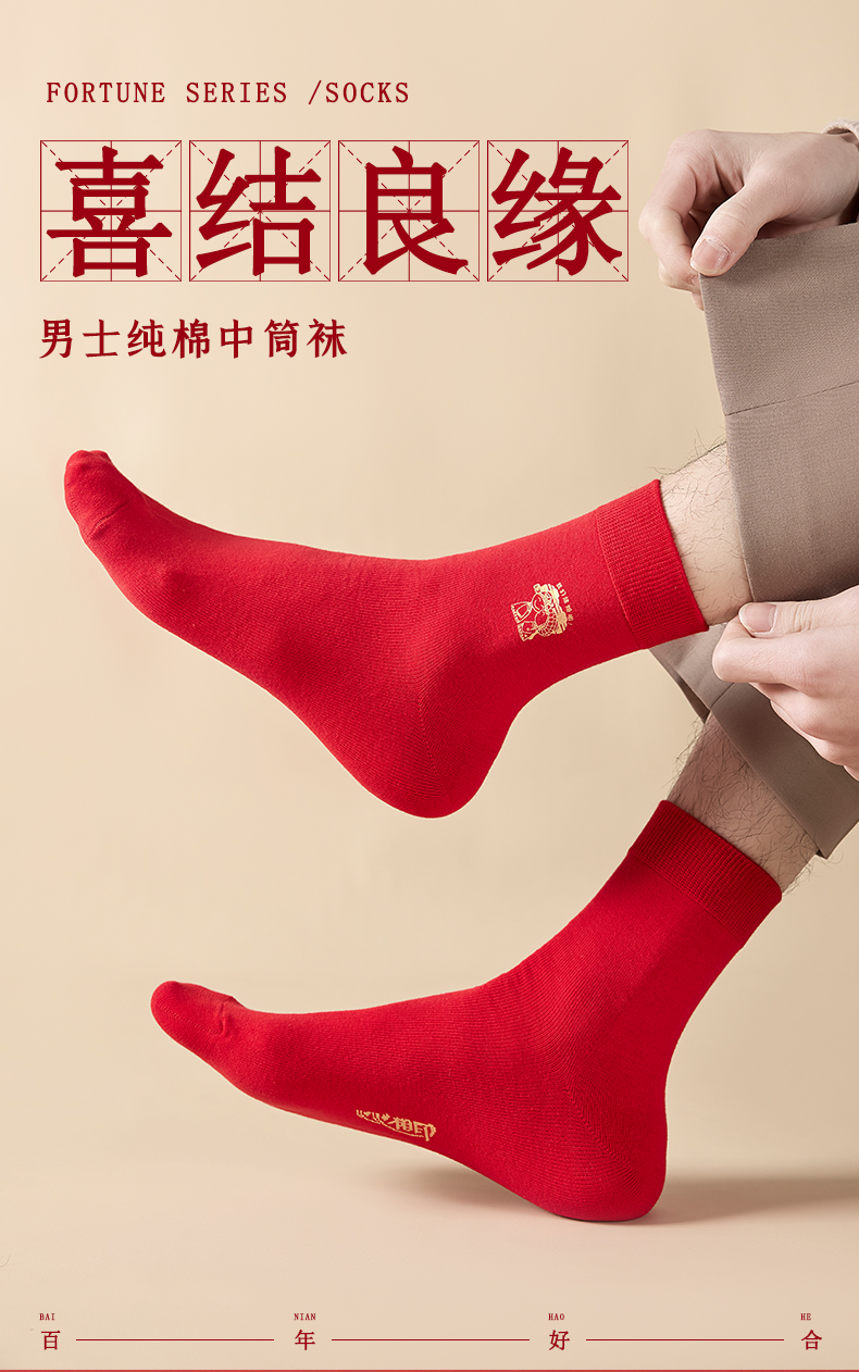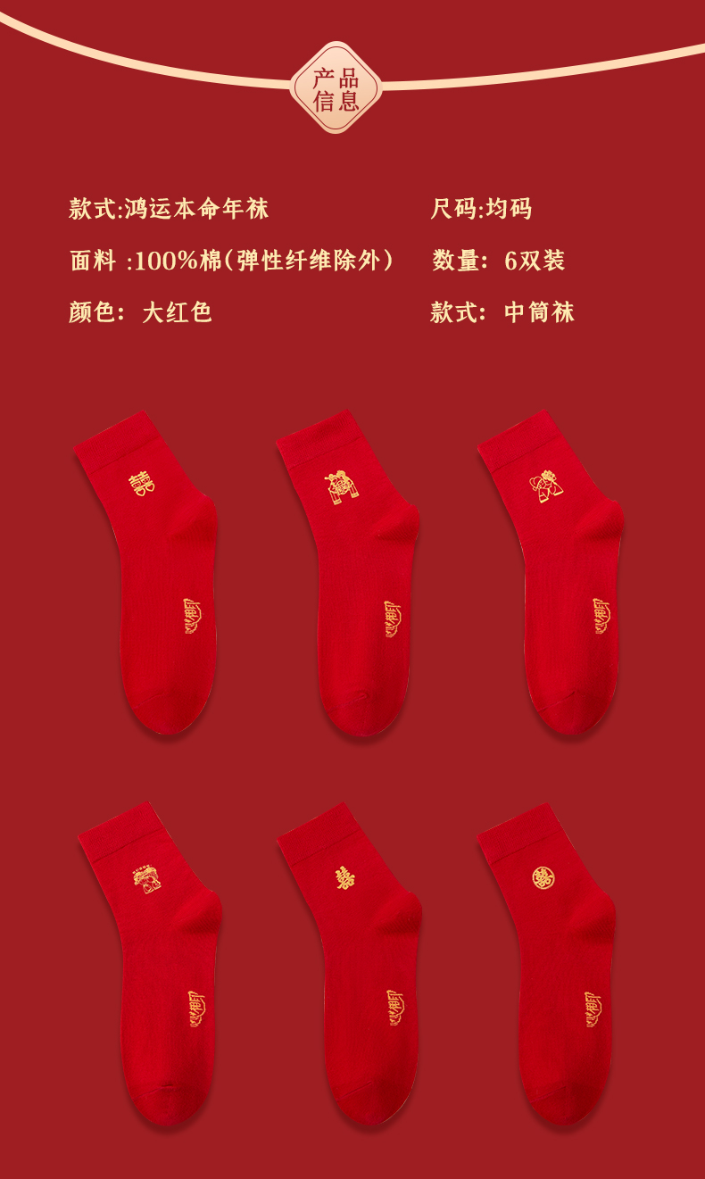 洁丽雅6双鸿运男袜纯棉大红喜庆中筒男袜大红袜子结婚袜子男