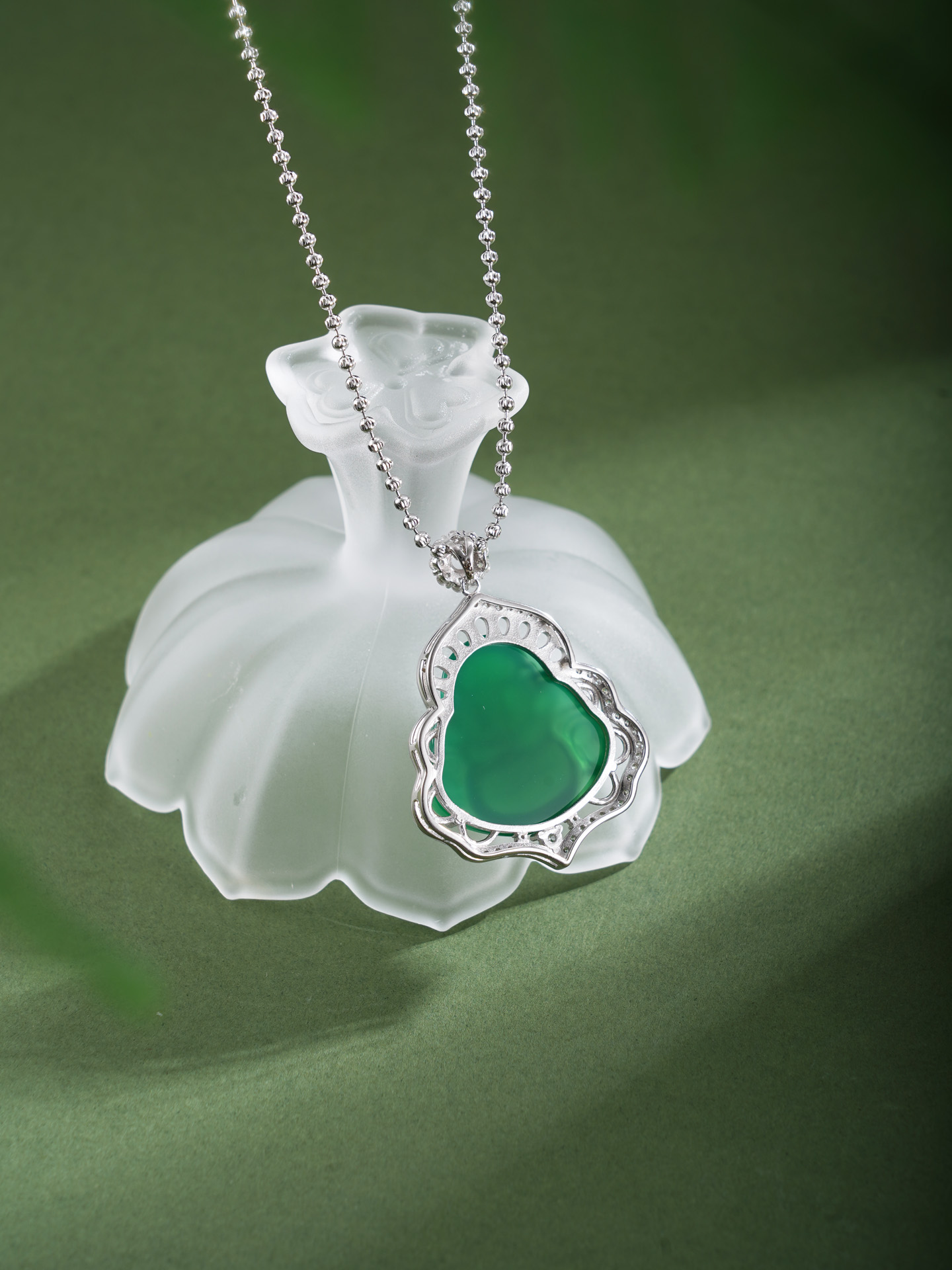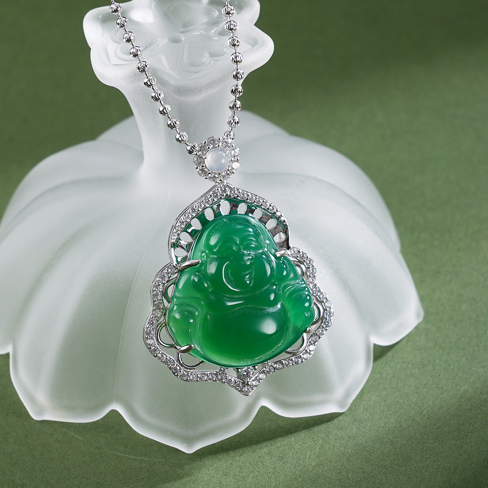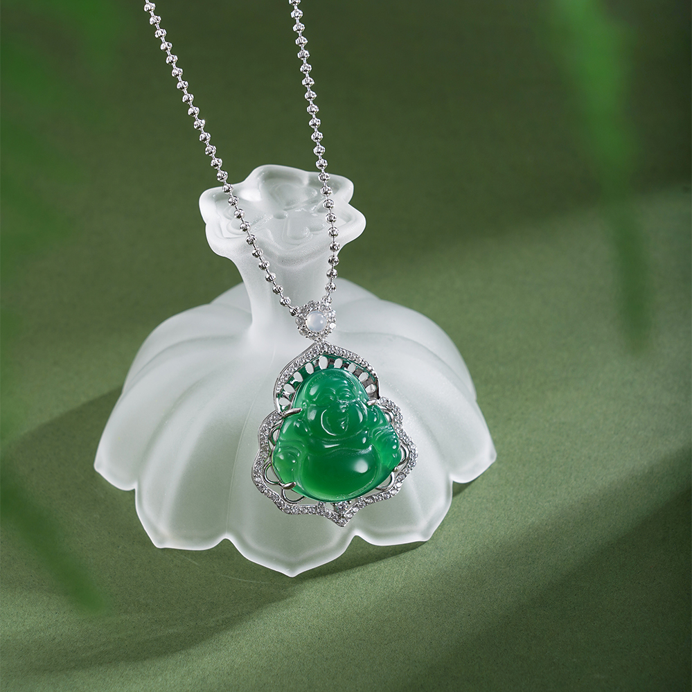 “大肚能容,容天下难容之事;开口便笑,笑世间可笑之人”。弥勒佛象征着无边的包容心,佩戴弥勒佛,也被视为“戴福上身”,纯银绿玉髓弥勒佛吊坠,寓意代代有福、福泽绵延。