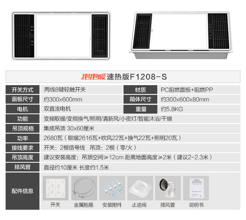 欧普(OPPLE)直流变频风暖浴霸灯排气扇一体集成吊顶卫生间暖风F1208-S