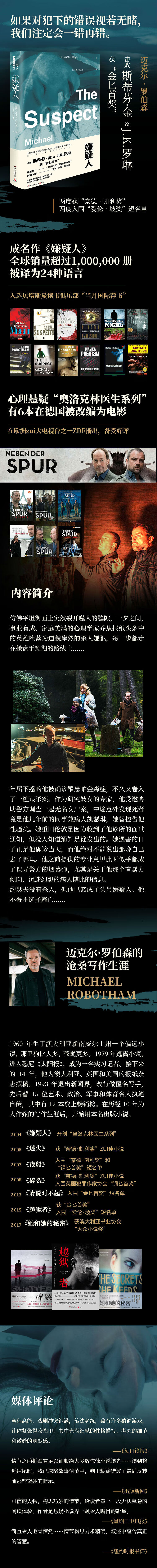 迈克尔·罗伯森 1960年生于澳大利亚新南威尔士州,1979年进入悉尼《太阳报》成为一名记者。在新闻业沉浮14年后,他改行做匿名写手,先后替15位艺术、政治、军事和体育名人执笔自传,其中有12本登上畅销榜。在历经10年为人作嫁的写作生涯后,他开始用本名出版小说。首部心理惊悚小说《嫌疑人》于2004年出版,入选贝塔斯曼读书俱乐部“当月国际荐书”,一炮而红,开创了心理悬疑“奥洛克林医生系列”。其中《碎裂》一书2008年获选澳大利亚“奈德·凯利奖”,入围英国犯罪作家协会“钢匕首奖”短名单。2015年出版的《越狱者》击败包括斯蒂芬·金在内的诸多热门人选获得英国犯罪作家协会“金匕首奖”,入围美国推理作家协会“爱伦·坡奖”短名单。《她和她的秘密》获澳大利亚书业协会2018年“大众小说奖”。
