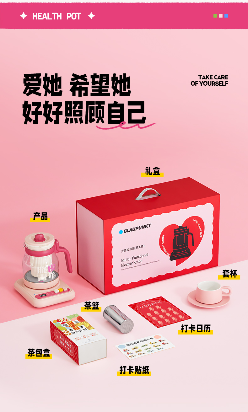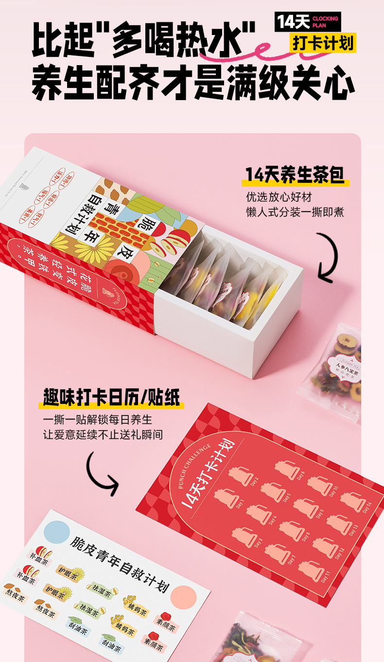 【产品明细】:底座、壶身、茶滤网、壶盖、茶包盒、打卡贴纸、打卡日历、套杯